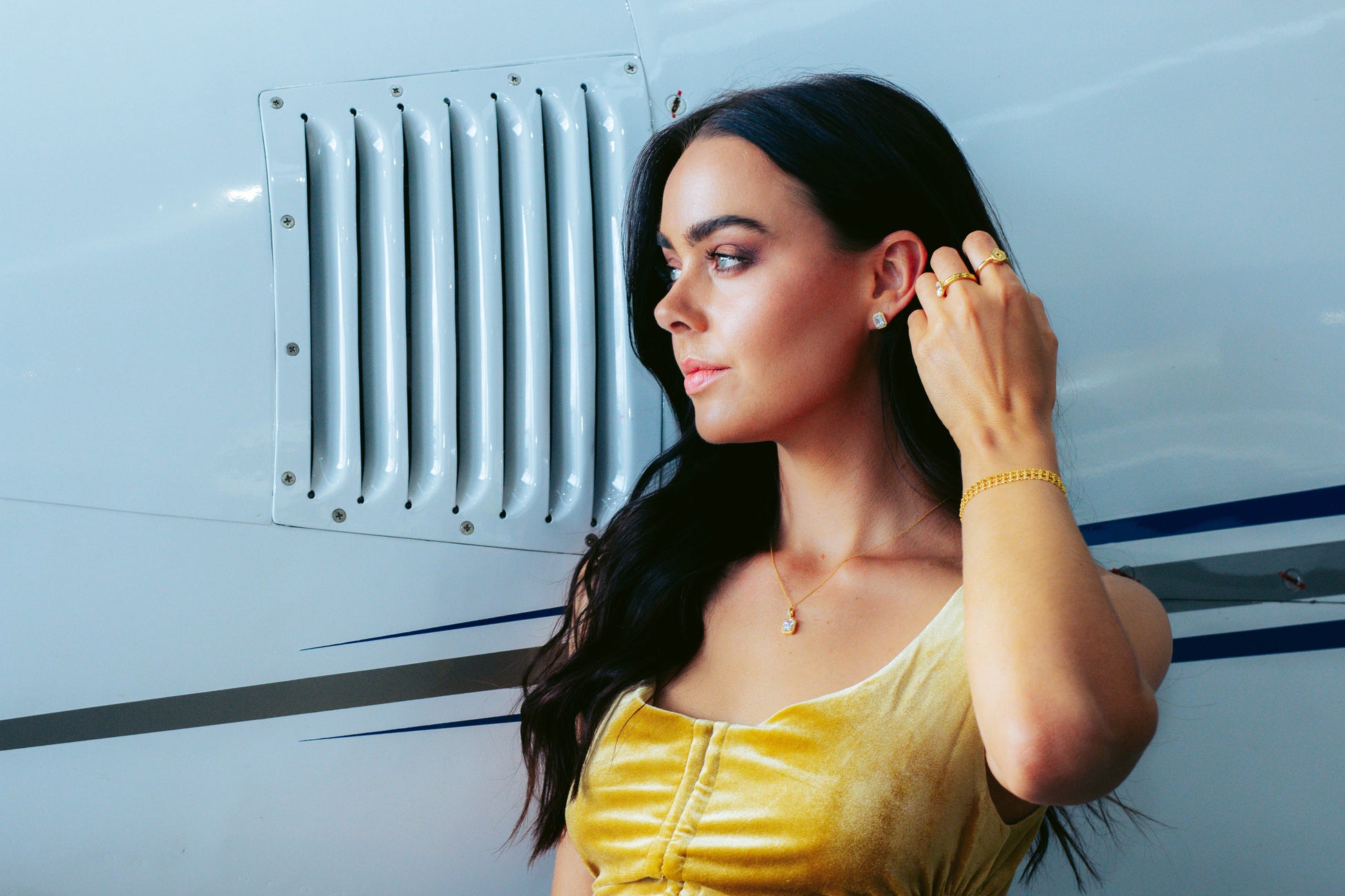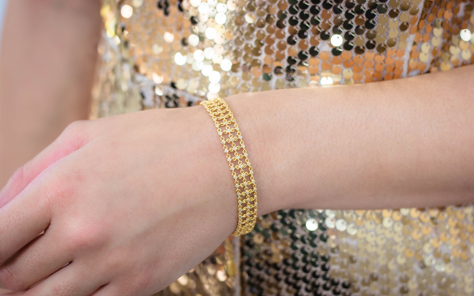 The Soignee (swän-'ya) collection is an exceptional and luxurious design created by Georgini. This lace-style bracelet curves to the wrist and features an intricate and delicate pattern that extends along the 16cm design. It also features a 4cm extender to adjust to various sizes. Expertly set with 111 sparkling stones, it is crafted from 18ct Gold Plated 925 Sterling Silver. The Soginee is available in a necklace, bracelet and earrings.