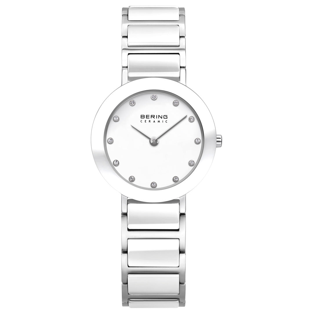 The polished silver coloured stainless steel case, made of pure, high quality, medical-grade stainless steel (316L), elegantly and seamlessly frames the white coloured dial. This is protected by an especially hard, crystal clear and scratch-resistant sapphire crystal. The sleekly burnished “Smooth Touch” finish of the ceramic, which makes the material soft to the touch, and the sparkling SWAROVSKI ELEMENTS on the dial complete the look of Nordic beauty.