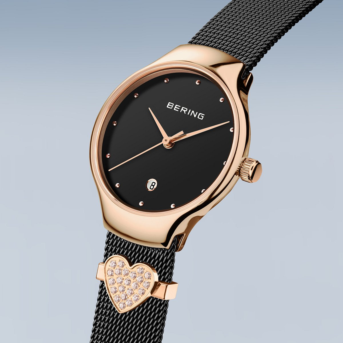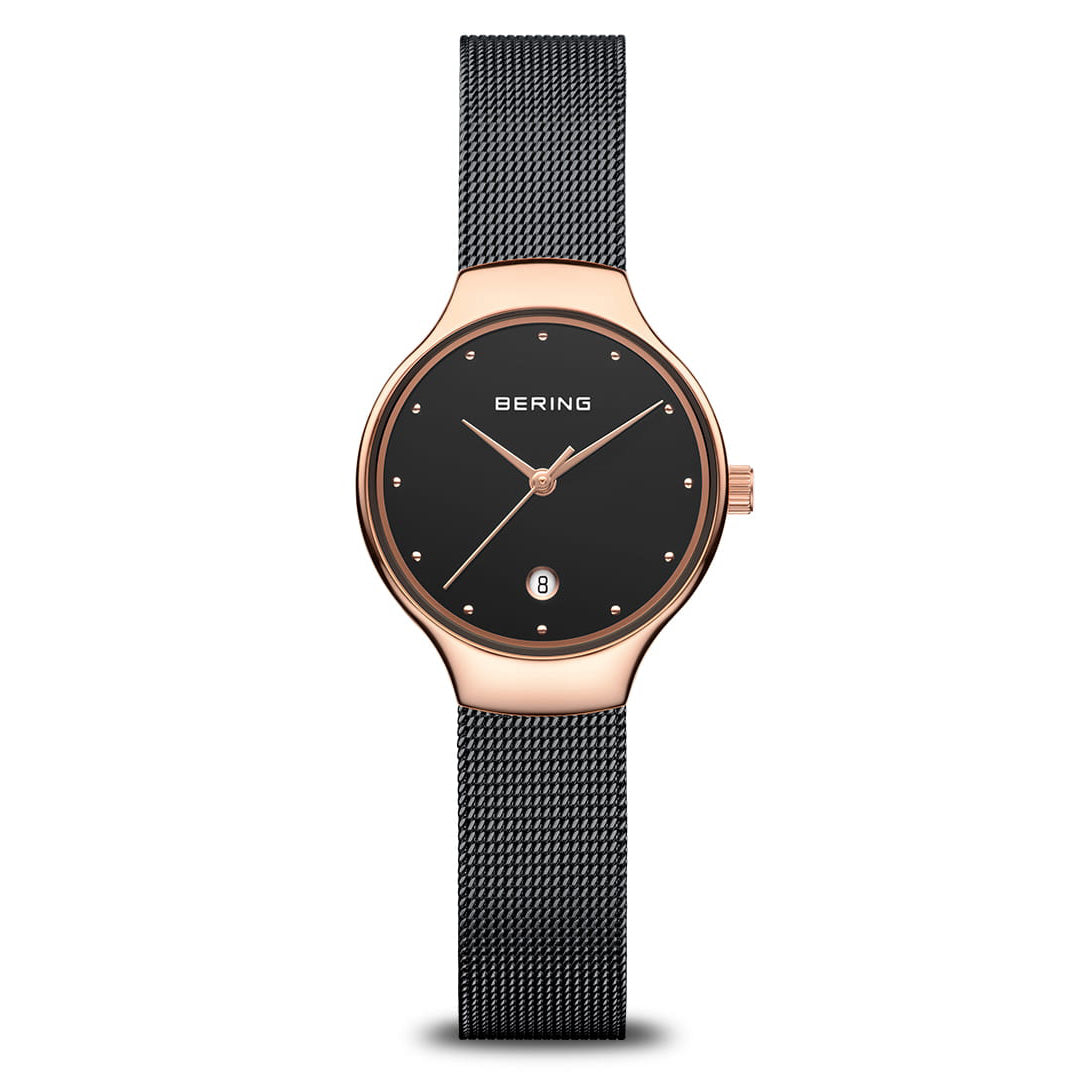 The polished rose gold colored stainless steel case, made of pure, high quality, medical-grade stainless steel (316L), in combination with the black colored modern milanese strap, provides the classic BERING look. The fine workmanship of the milanese strap gives the watch a refined, almost noble touch. A dial with rose gold colored index points and protected by crystal clear, scratch-resistant sapphire crystal perfectly completes the classic look.