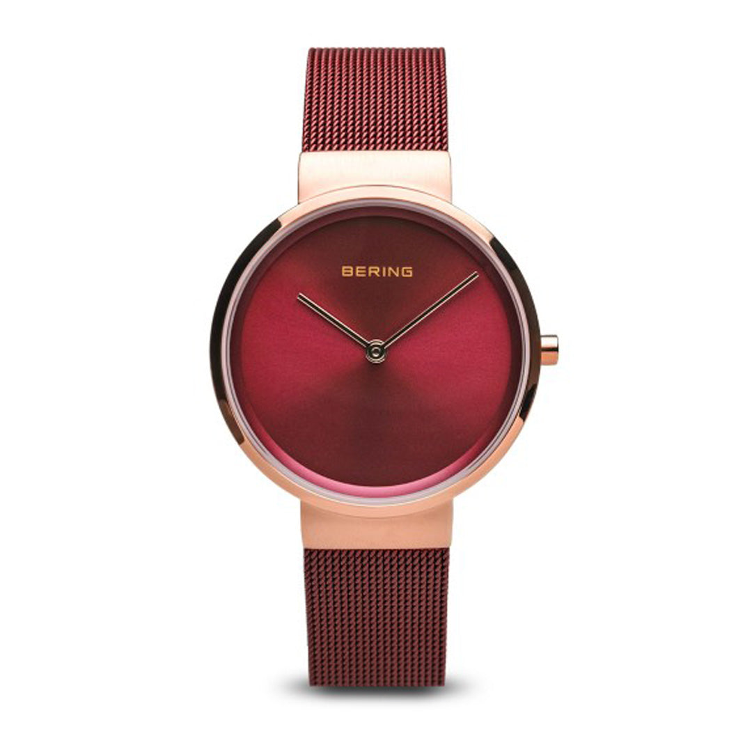Bering Classic Brushed Rose Gold Red Mesh Watch
