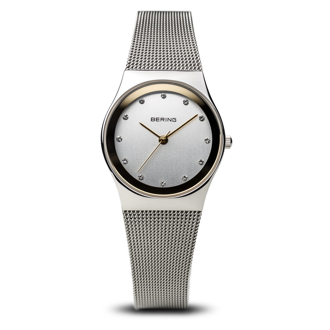 The polished silver colored stainless steel case, made of pure, high quality, medical-grade stainless steel (316L), in combination with the modern silver colored milanese strap, provides the classic BERING look. The fine workmanship of the milanese strap gives the watch a refined, almost noble touch. A white colored dial embellished with SWAROVSKI ELEMENTS and protected by crystal clear, scratch-resistant sapphire crystal perfectly completes the classic look.