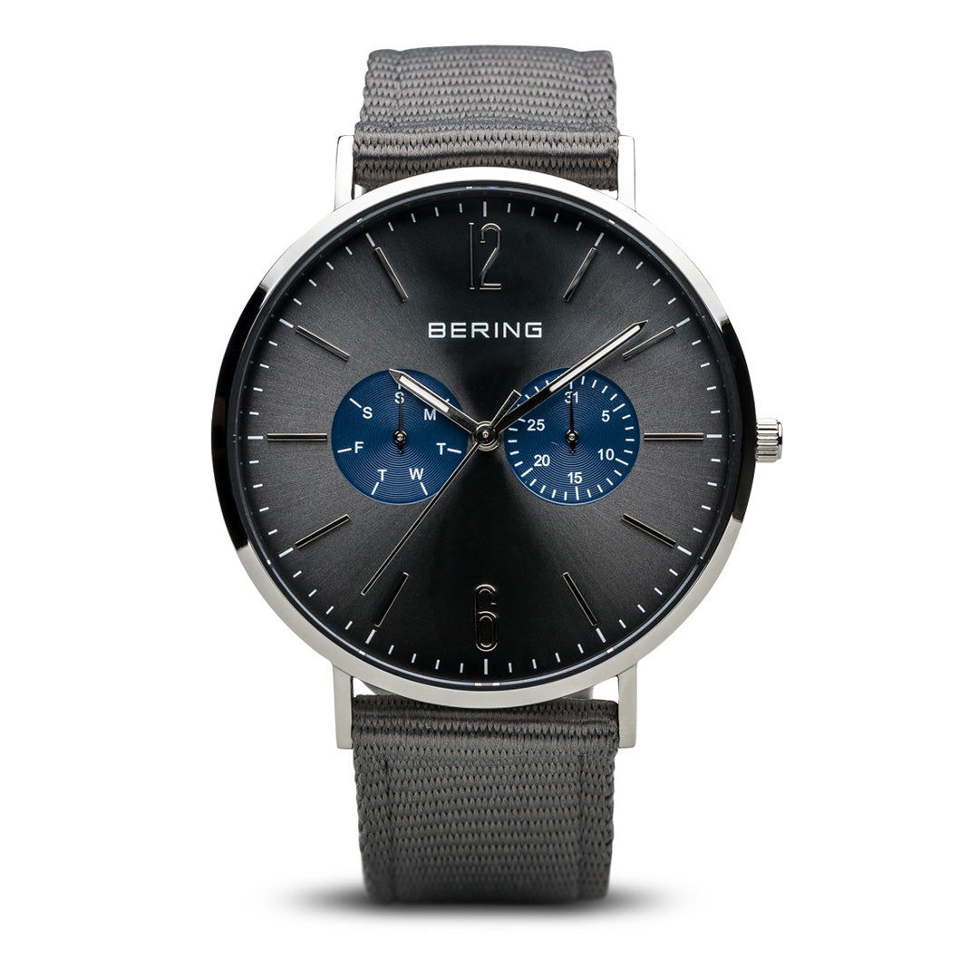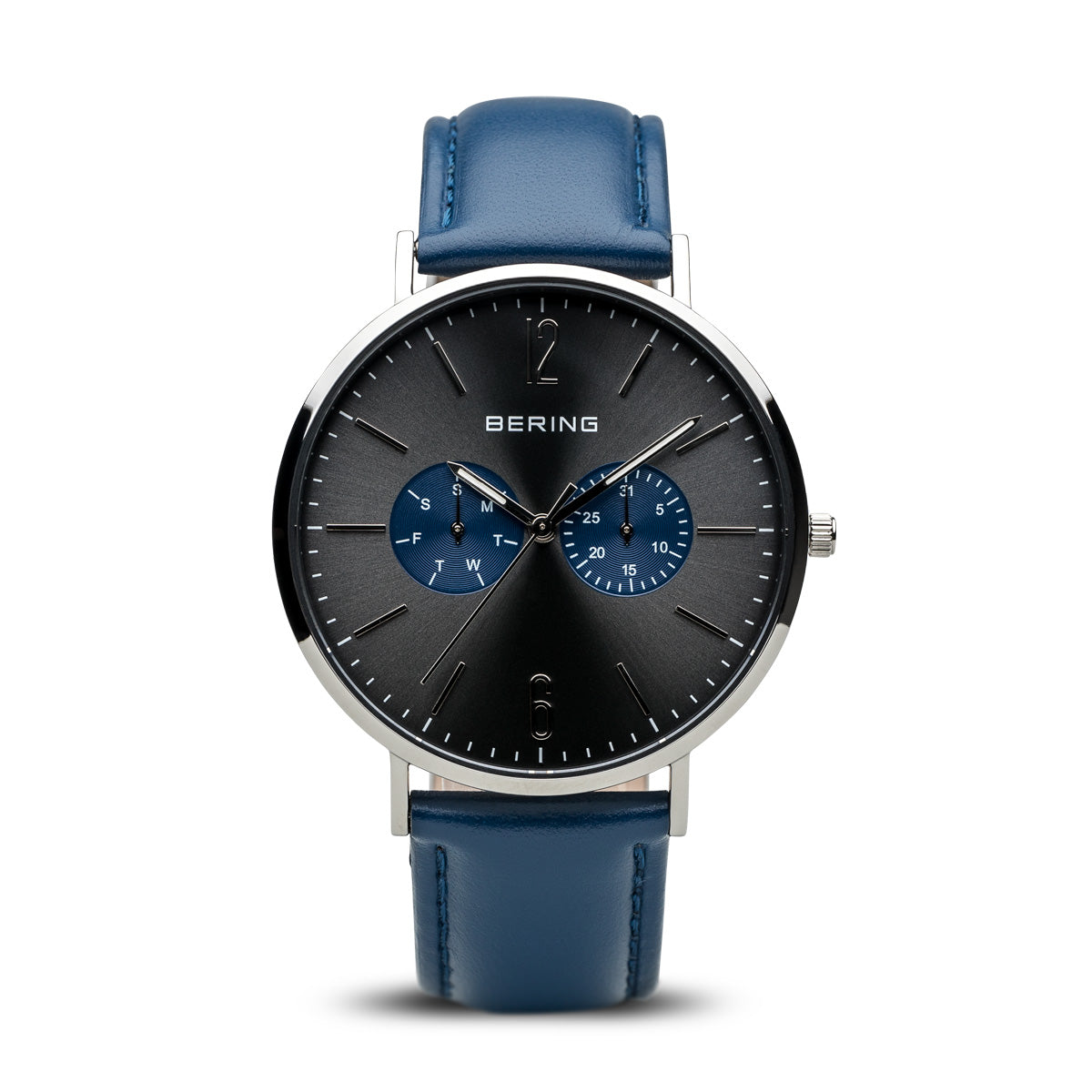 The polished silver colored stainless steel case, made of pure, high quality medical-grade stainless steel (316L), in combination with the modern blue colored calf leather strap, provides the classic BERING look. The finely made leather band gives the watch a distinguished, almost noble touch. Integrated multi-function indicators (day/date) and silver colored indices complete the fashionable Sunray dial. An especially hard, crystal clear and scratch-resistant sapphire crystal ensures a clear view of the strikingly beautiful dial. As a special highlight of the collection, the calf leather strap can be swapped with a grey colored nylon band for more diversity of style.