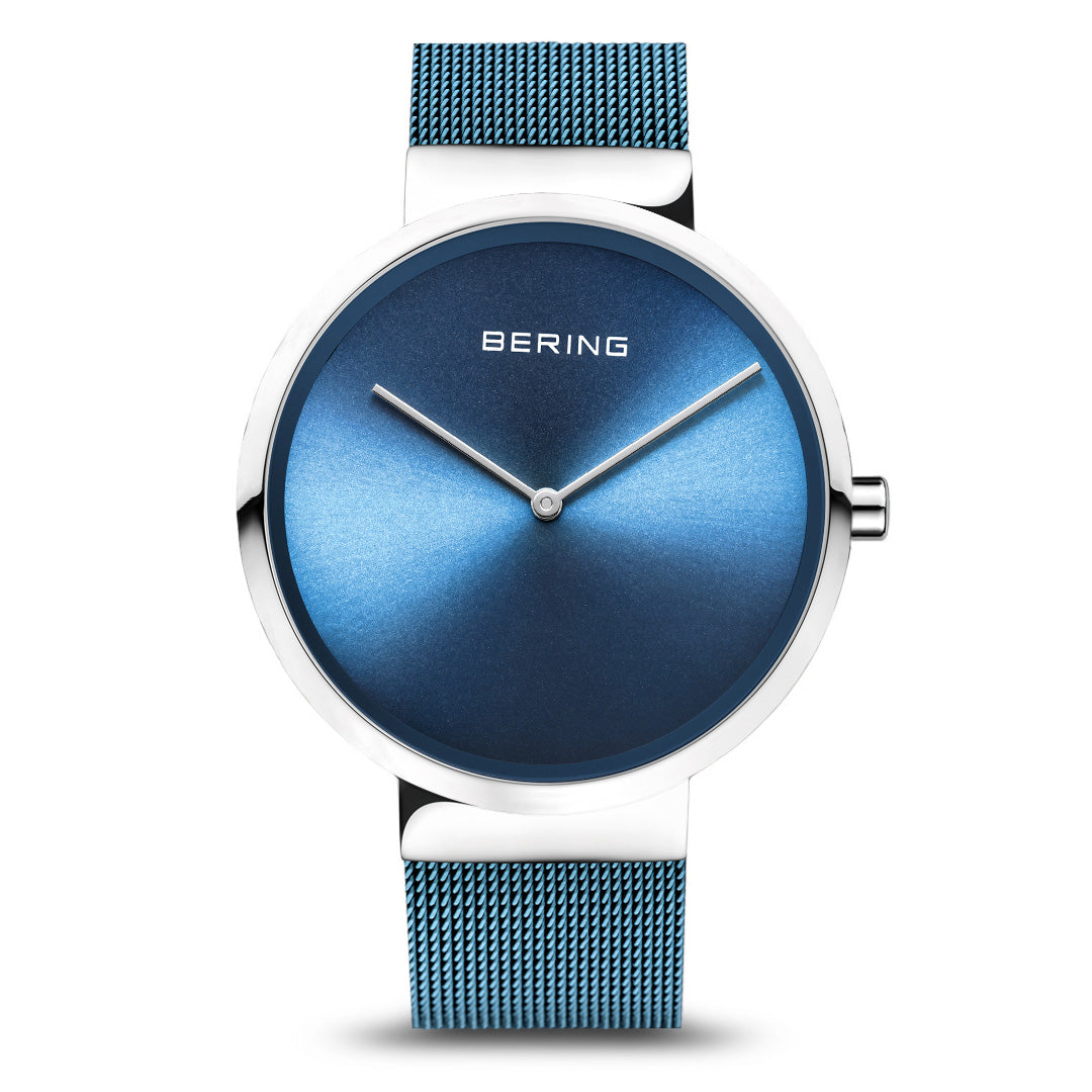 The polished silver colored stainless steel case, made of pure, high quality, medical-grade stainless steel (316L), in combination with the modern blue colored milanese strap, provides the classic BERING look. The fine workmanship of the milanese strap gives the watch a refined, almost noble touch. A minimalist Sunray dial which matches the band, protected by crystal clear, scratch-resistant sapphire crystal, perfectly completes the modern look.