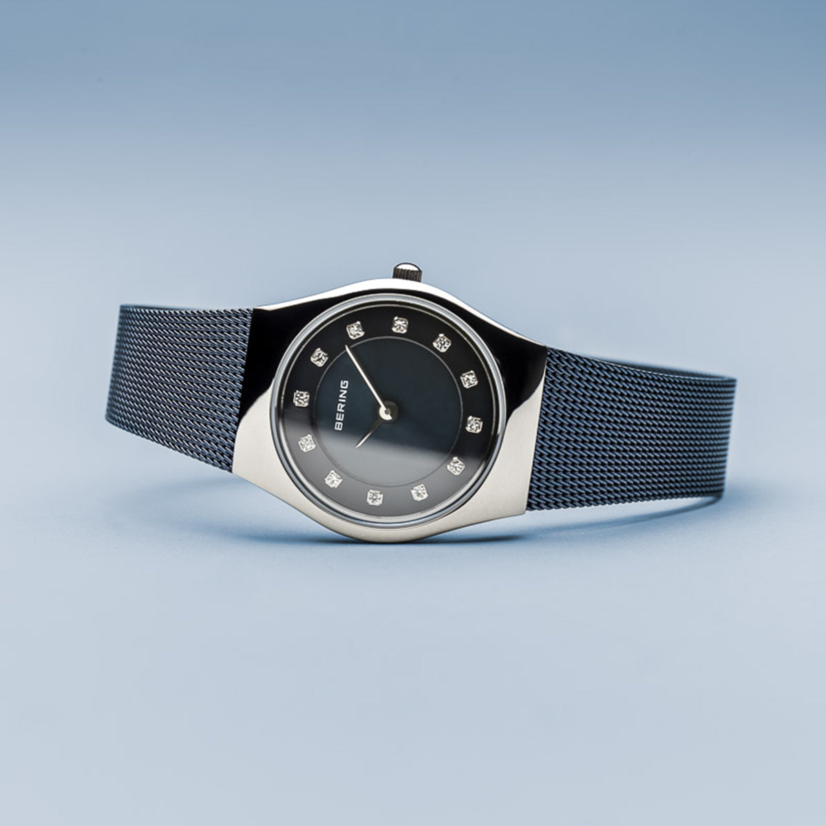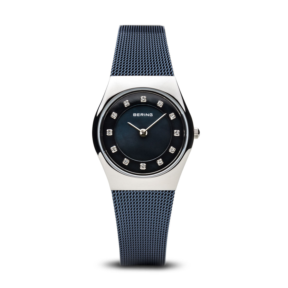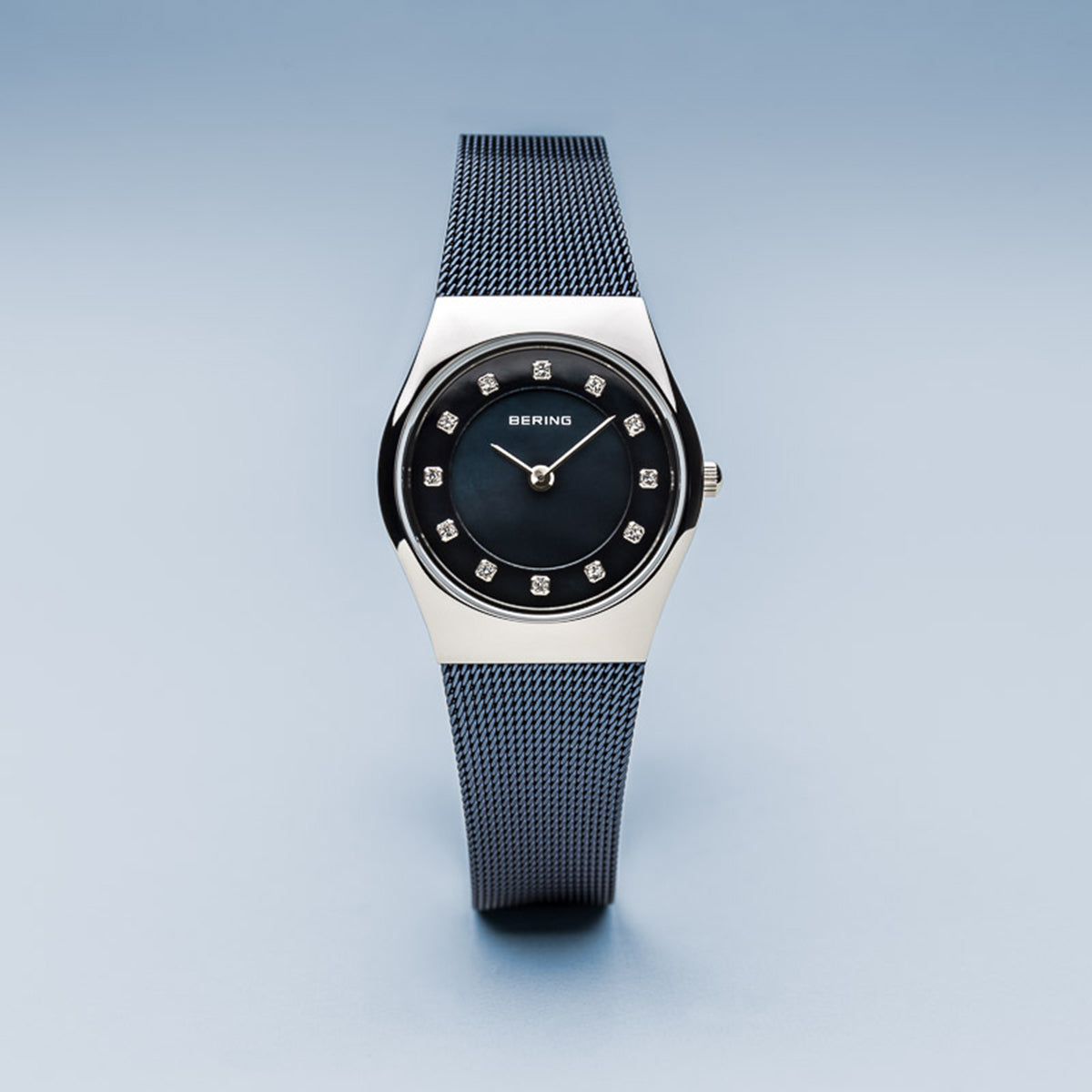The polished silver colored stainless steel case, made of pure, high quality, medical-grade stainless steel (316L), in combination with the modern blue colored milanese strap, provides the classic BERING look. The fine workmanship of the milanese strap gives the watch a refined, almost noble touch. A mother of pearl dial embellished with SWAROVSKI ELEMENTS and protected by crystal clear, scratch-resistant sapphire crystal perfectly completes the classic look.