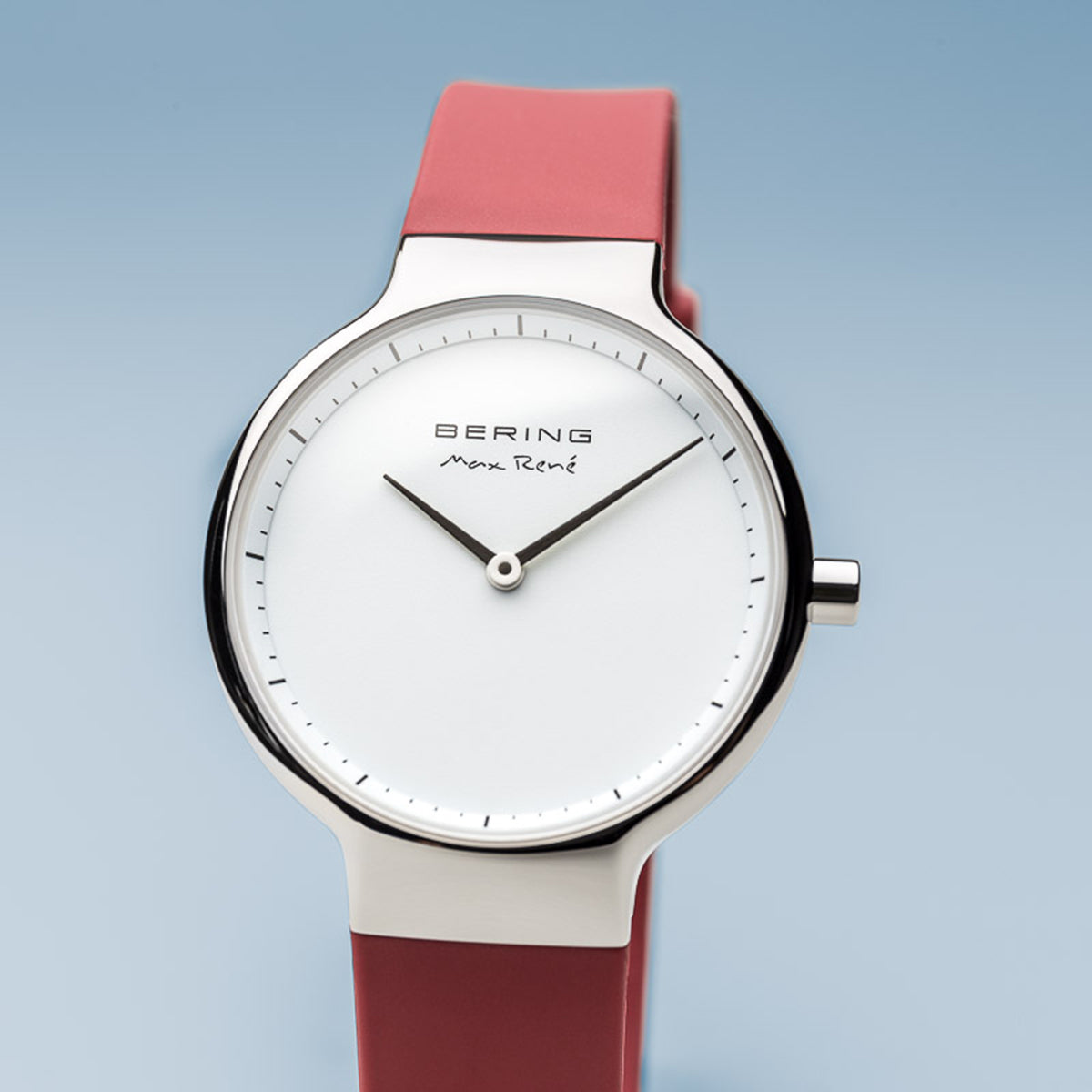 The dial is distinguished by its elegant simplicity and is protected by an especially hard, crystal clear and scratch-resistant sapphire crystal. A matching red coloured silicon strap makes for a strikingly modern accent. The original contrast of the red coloured silicon strap emphasizes the watch perfectly.