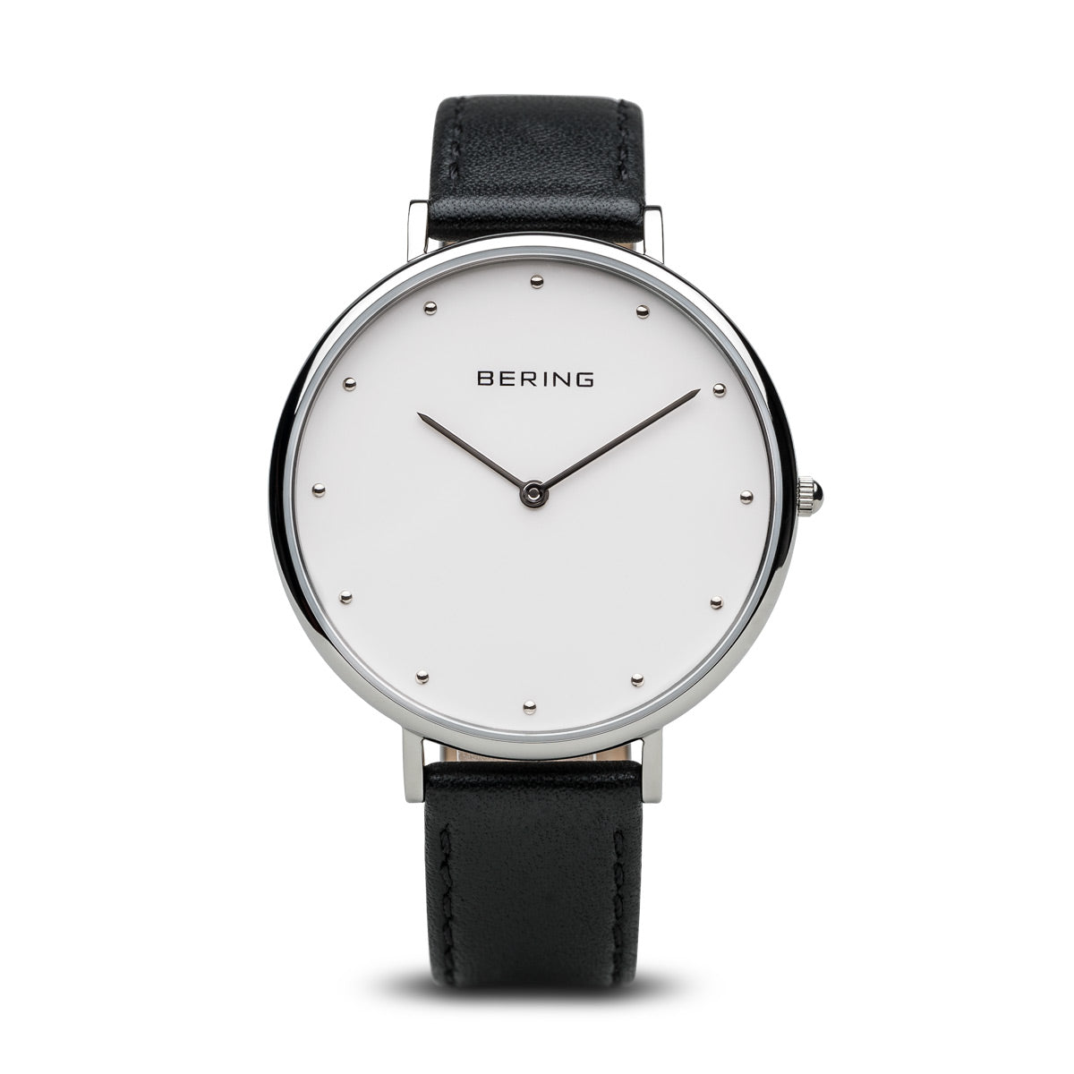 The polished silver coloured stainless steel case, made of pure, high quality medical-grade stainless steel (316L), in combination with the modern black coloured calf leather strap, provides the classic BERING look. The finely made leather band gives the watch a distinguished, almost noble touch. A dial with silver coloured index points and protected by crystal clear, scratch-resistant sapphire crystal perfectly completes the classic look.