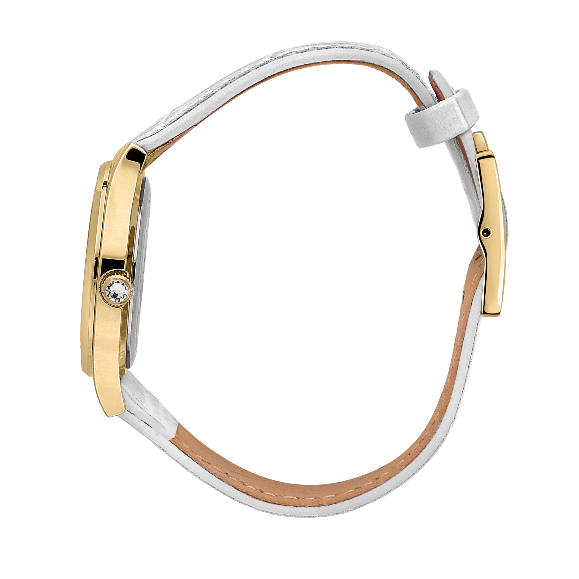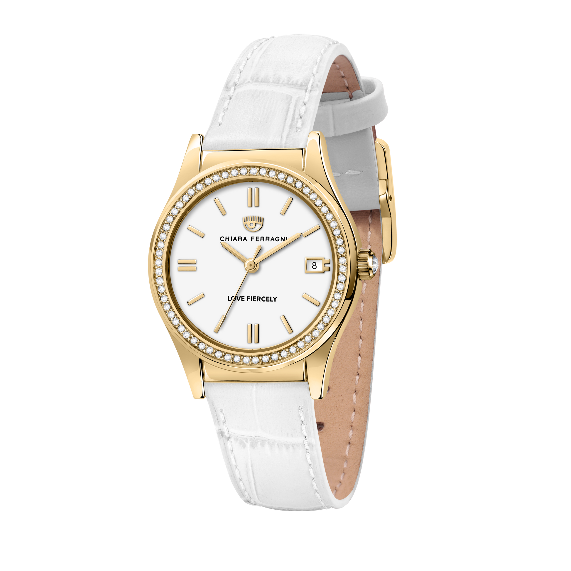Presenting the Contemporary White 32mm watch, featuring a yellow gold zircon embedded case and a white leather strap. Perfect as a gift, or to complement a range of outfits. Live life the Italian way!