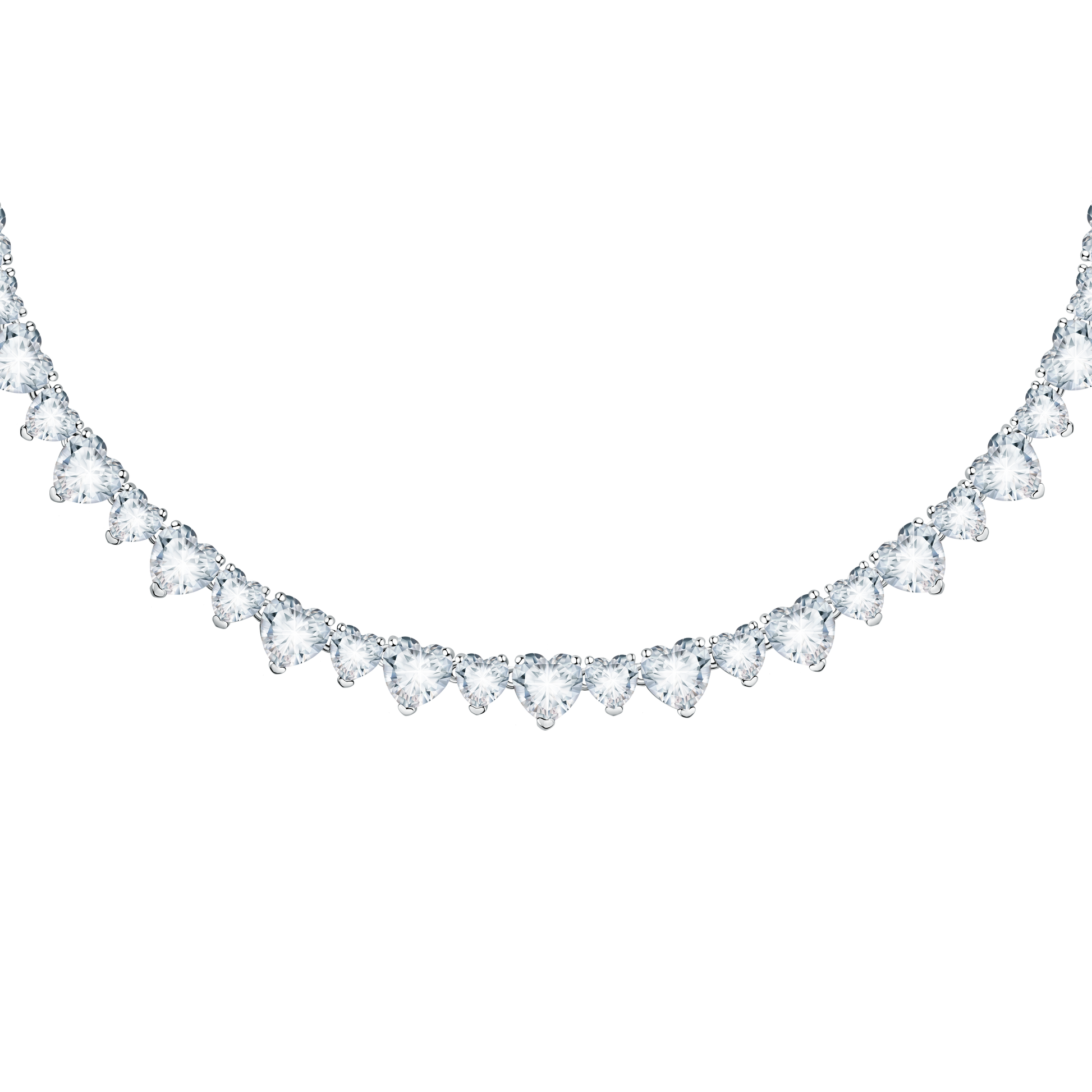Presenting the Diamond Heart Necklace. Featuring glittering white heart stones on a silver chain, this necklace is perfect as a gift, or to complement an array of outfits.