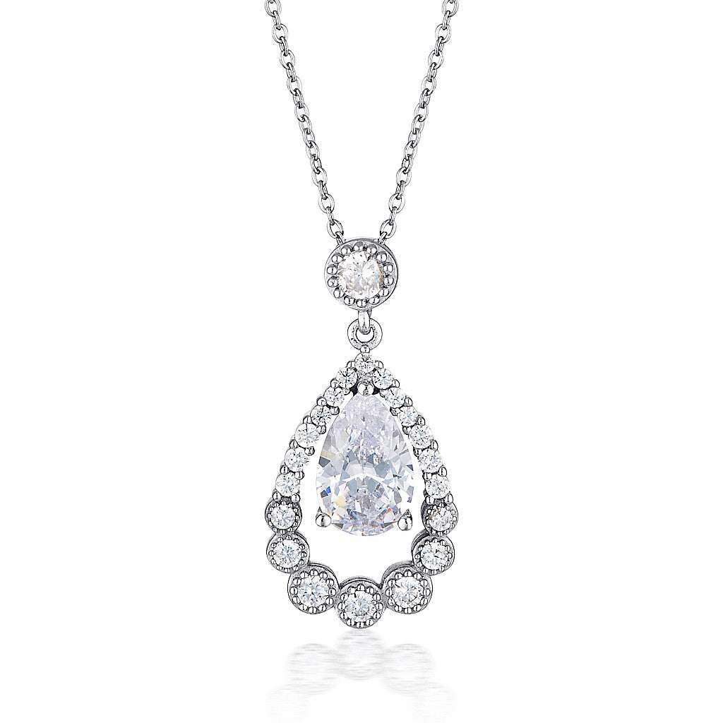Simply stunning! This rhodium plated 925 sterling silver drop pendant offers an elegant teardrop design of flawless glamour. Featuring sparkling pear shaped cubic zirconia drops surrounded by a pear shaped halo of stones this pendant captures the light with captivating grace. The Chloe Teardrop pendant is the perfect bridal pendant or a glamorous touch for your next special event.