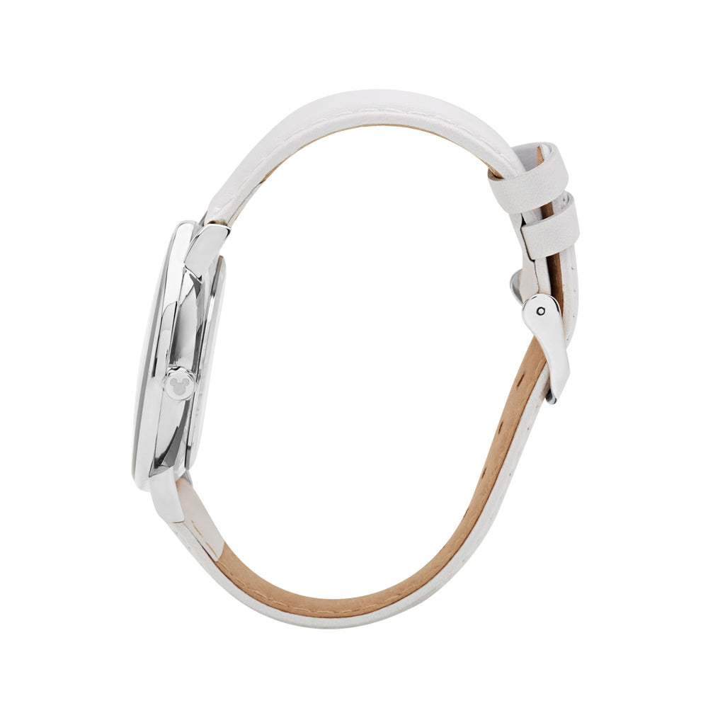 Disney presents the Formal Mickey Silver collection of watches. A formal Mickey Mouse watch? That sounds like a tall order. That is why Disney brings to you the Disney Formals range. Featuring an Original Mickey Mouse sunray dial, this watch is a study in contrasts. The plain unnumbered white dial set in a silver stainless steel case accentuated by a white leather strap gives the watch a vintage look, while the Mickey Mouse on the dial adds a splash of colour, making this watch a unique timepiece. Perfect for every day wear and formal dinners alike, this is a watch for the unapologetically bold.