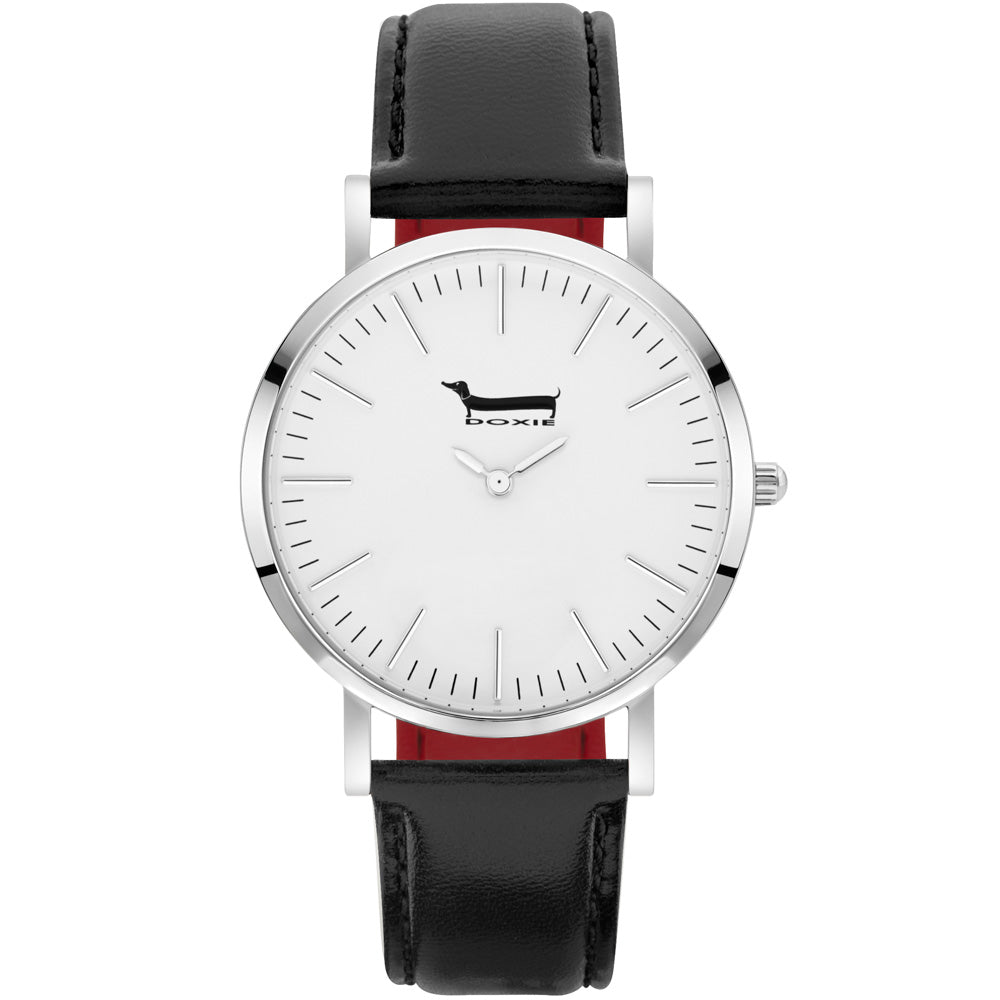 Doxie Women's Quartz George 40mm Silver Case Watch with Black Leather Strap analog Display and Leather Strap, DX0102