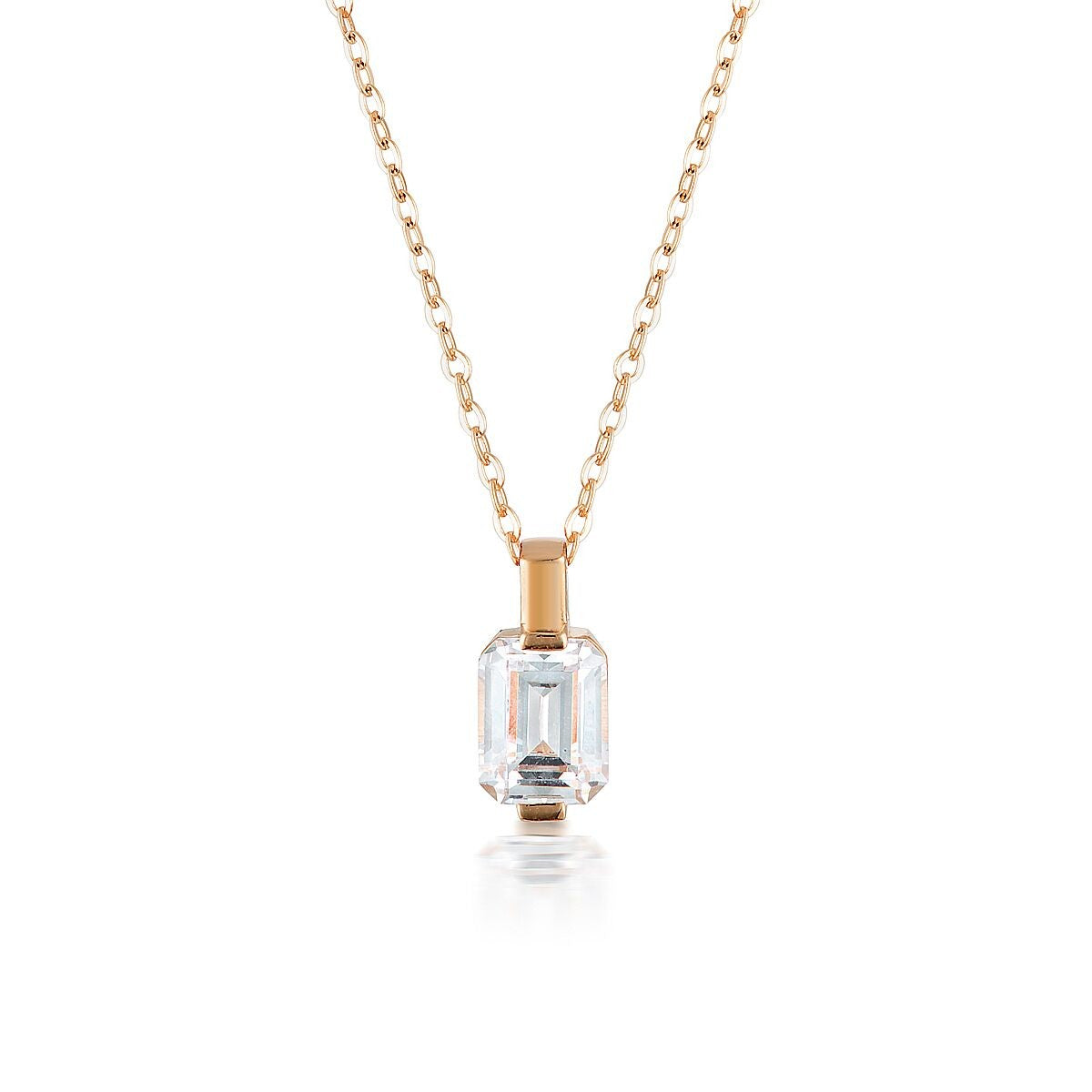 "Stand out from the crowd in the Rose Gold Emilio pendant. The Emilio pendant features a single perfectly cut emerald shape cubic zirconia stone, each facet capturing the light and shining in a multitude of flashes. The setting features high shine rose gold plated sterling silver and simple, modern clean lines.