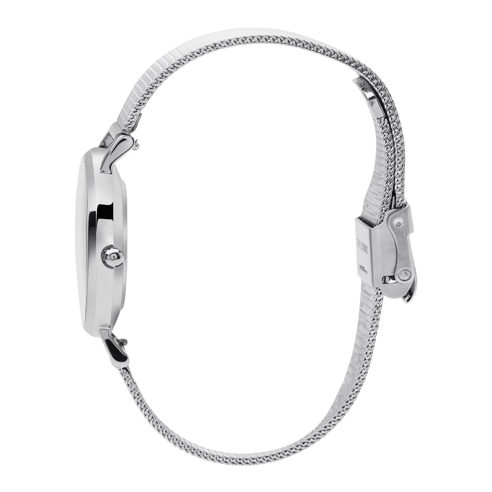 The modern design of the Frieda & Dori watch features a beautiful silver mesh strap.