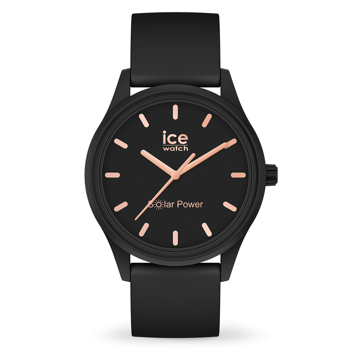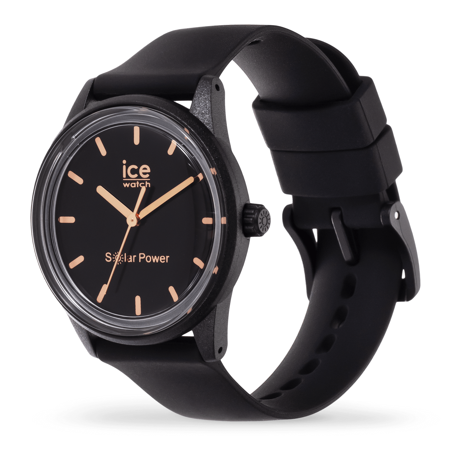 Go green and do your bit for the planet with the new ICE solar power black rose gold watch. The small black solar-powered timepiece is ultra slim and feather light. Made from super soft silicone and featuring a sleek dial, this elegant model is the ultimate minimalist statement. You will love the chic, sophisticated rose gold details. Simply expose it to natural or artificial light to charge, then sit back and enjoy as it lasts and lasts! It comes in a reusable felt pouch made from recycled plastic bottles.