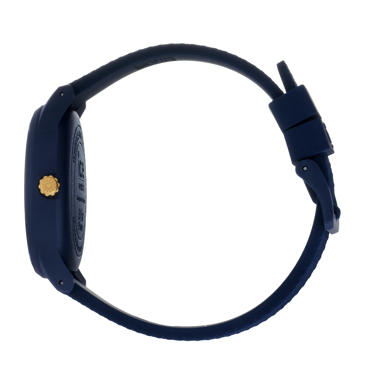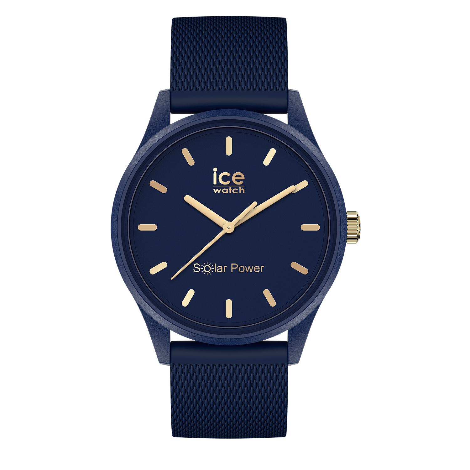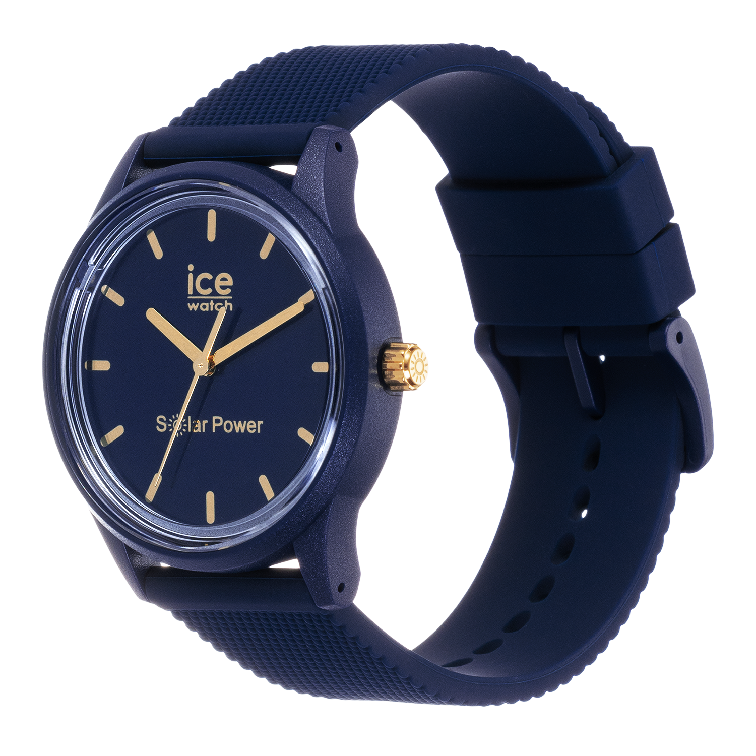 Go green and do your bit for the planet with the new ICE solar power navy gold watch. The solar-powered timepiece is ultra slim and feather light. With its strap made from super soft silicone, this feminin model is the ultimate minimalist statement. Simply expose it to natural or artificial light to charge, then sit back and enjoy as it lasts and lasts! It comes in a reusable felt pouch made from recycled plastic bottles.