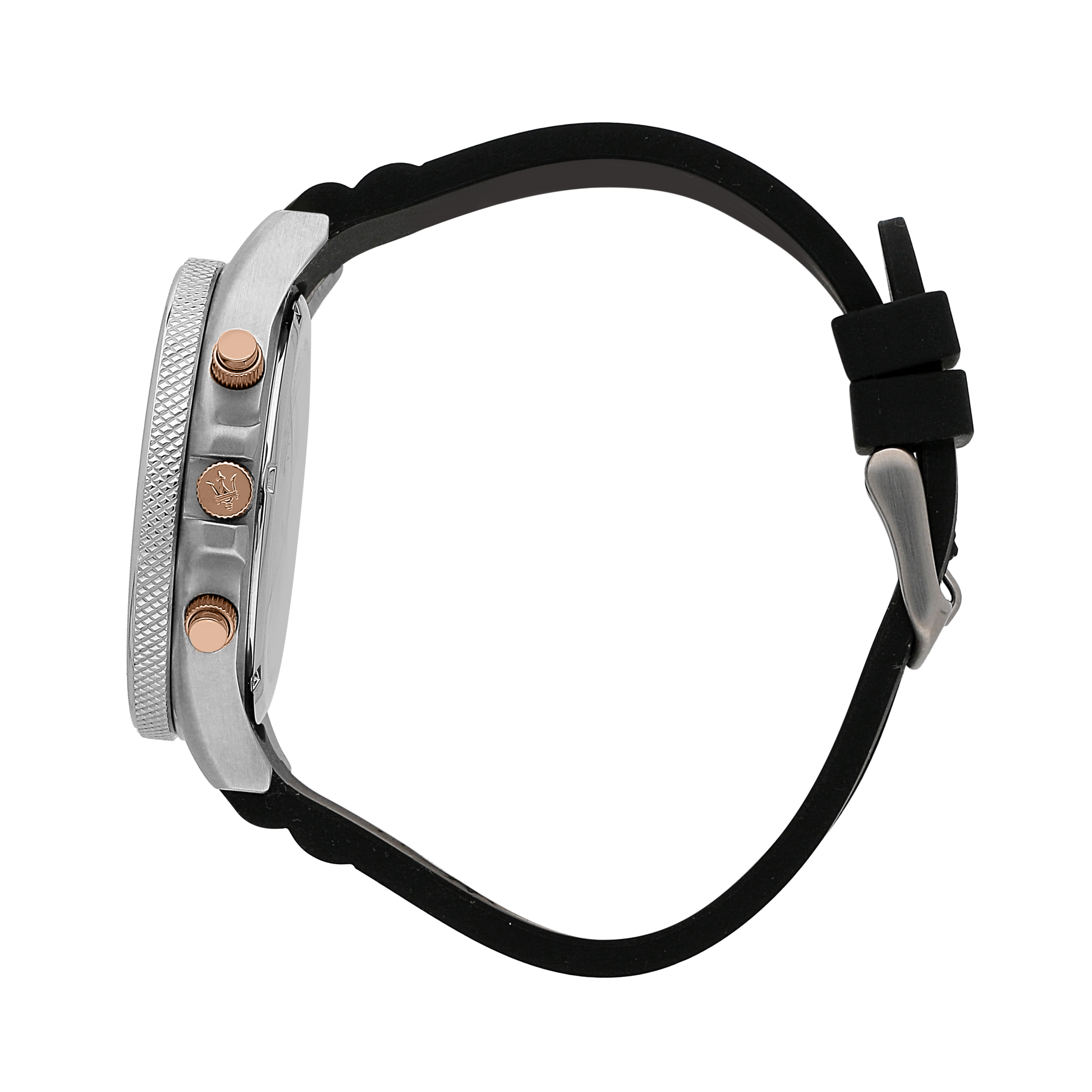 Presenting the Maserati Sfida 44mm Black Watch. The Maserati Sfida Collection consists of watches with sporty elegance, characterized by a structured design, steel case (44mm) with rotating or tachymeter bezel, knurling finish on one side. The sunray effect or modern dégradé dials offer elegance and rigour, distinctive features of Maserati maison. The new models from Sfida collection are based on Maserati's values and sporting heritage. Detailed watch constructions and colour nuances enhance the super luxury brand DNA.
