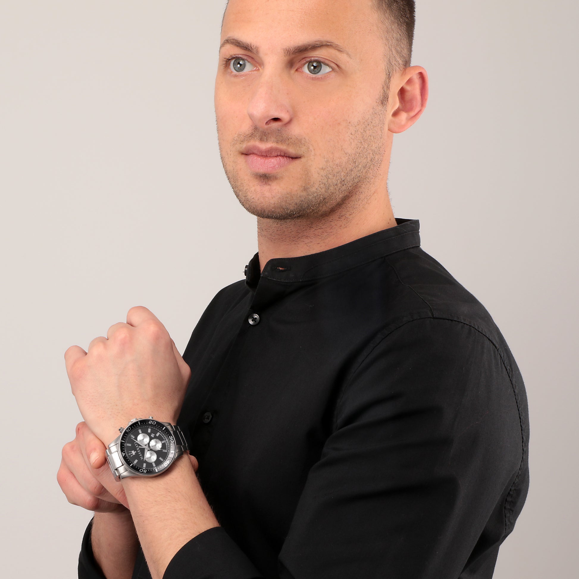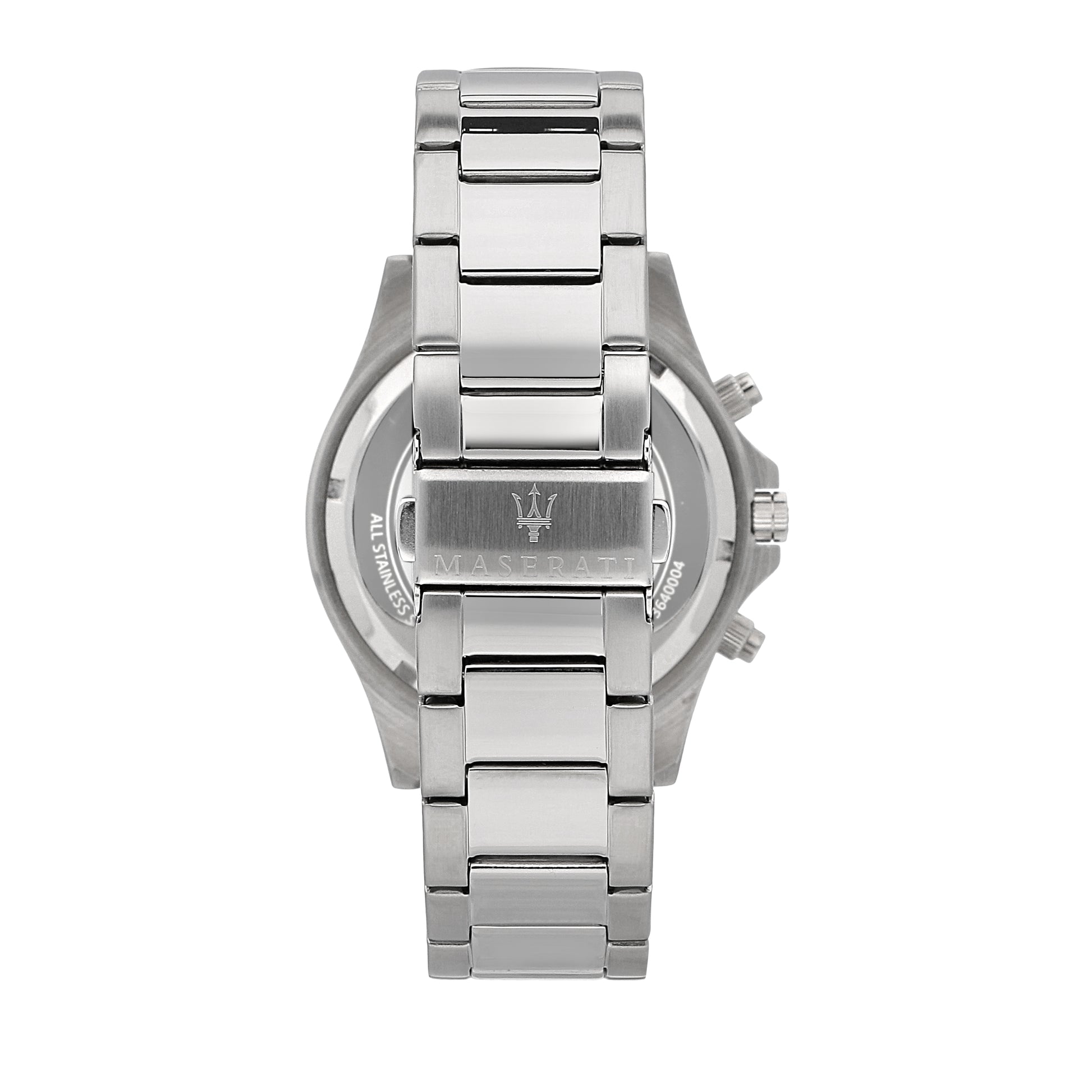 Presenting the Maserati Stile Silver Chronograph Watch. Welcome to the Maserati Stile Collection: watches that take up the mechanics, construction and stylistic codes of the iconic sporting watchmaking timepieces. The decisive lines, the distinctive decagonal bezel and the slim case are combined with details that strongly identify the sporting world such as: pump pushers, screw-down crown, multi-level dial, applied luminescent indexes, luminescent hands and a buckle with a personalised butterfly clasp featuring the applied Trident.