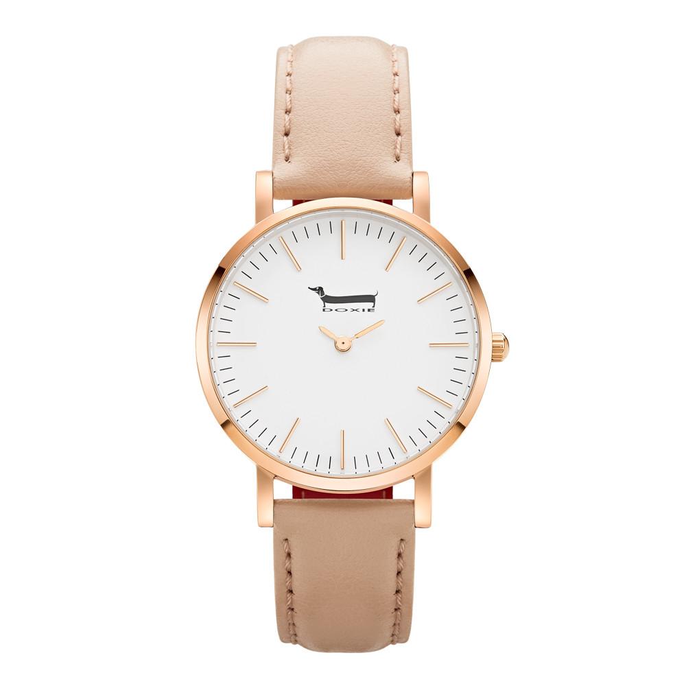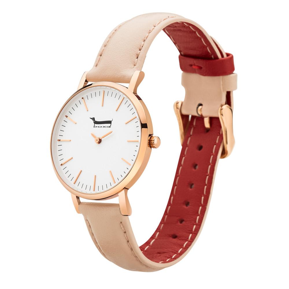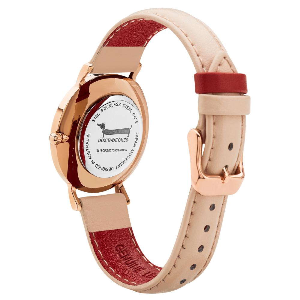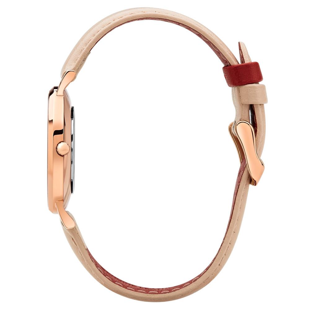 The elegant design of the Penelope watch combines a quality peach leather strap with the signature red leather inner and keeper on a rose gold case.