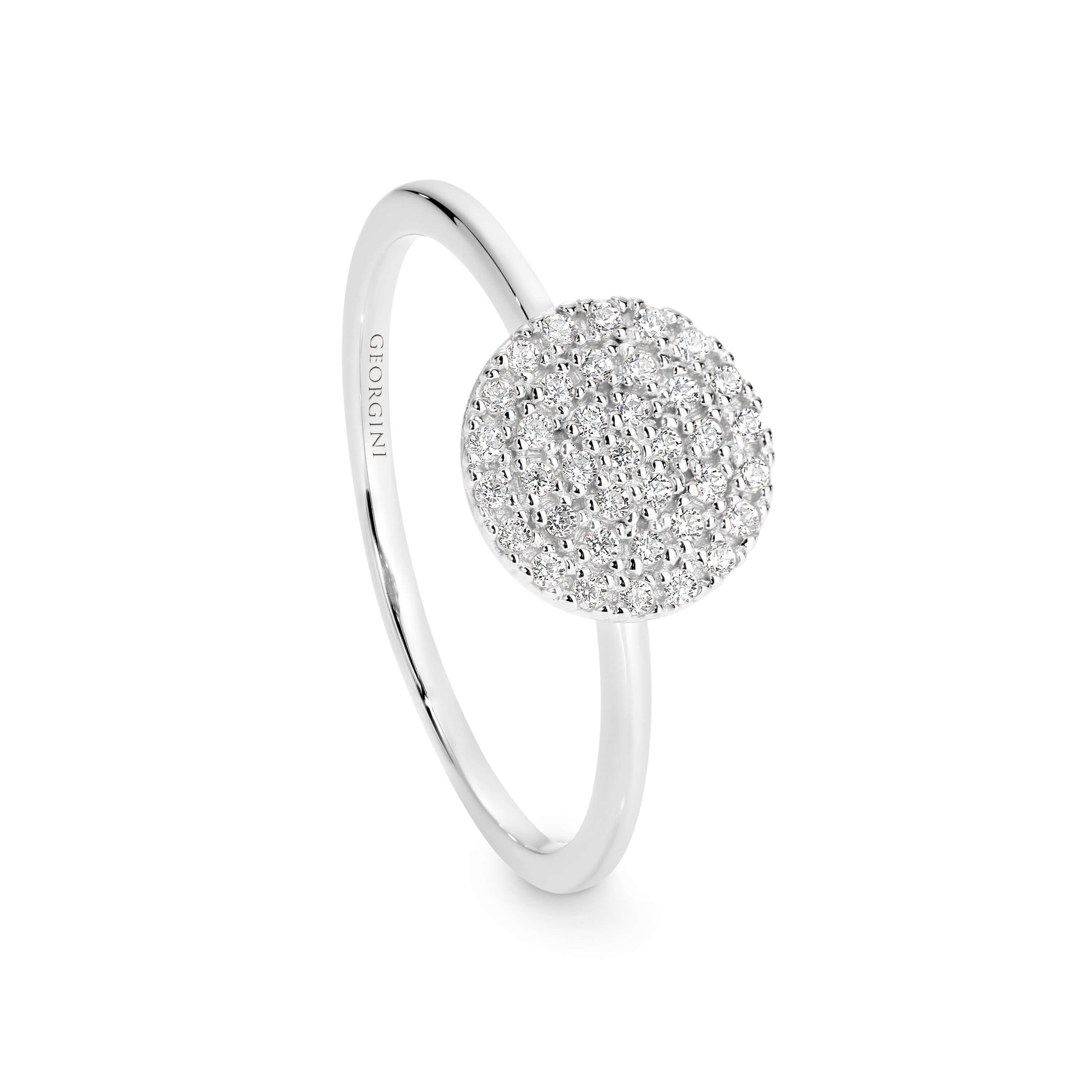Create a modern and fashionable look with this timeless beauty. Hand cut, hand set cubic zirconias take centre stage, set on a stunning dome of Rhodium Plated 925 Sterling Silver, creating a look of understated glam. This pave ring is a symbol of contemporary elegance and is definitely one of our favourites at Georgini. Match it up with the pendant and earrings to complete your look!
