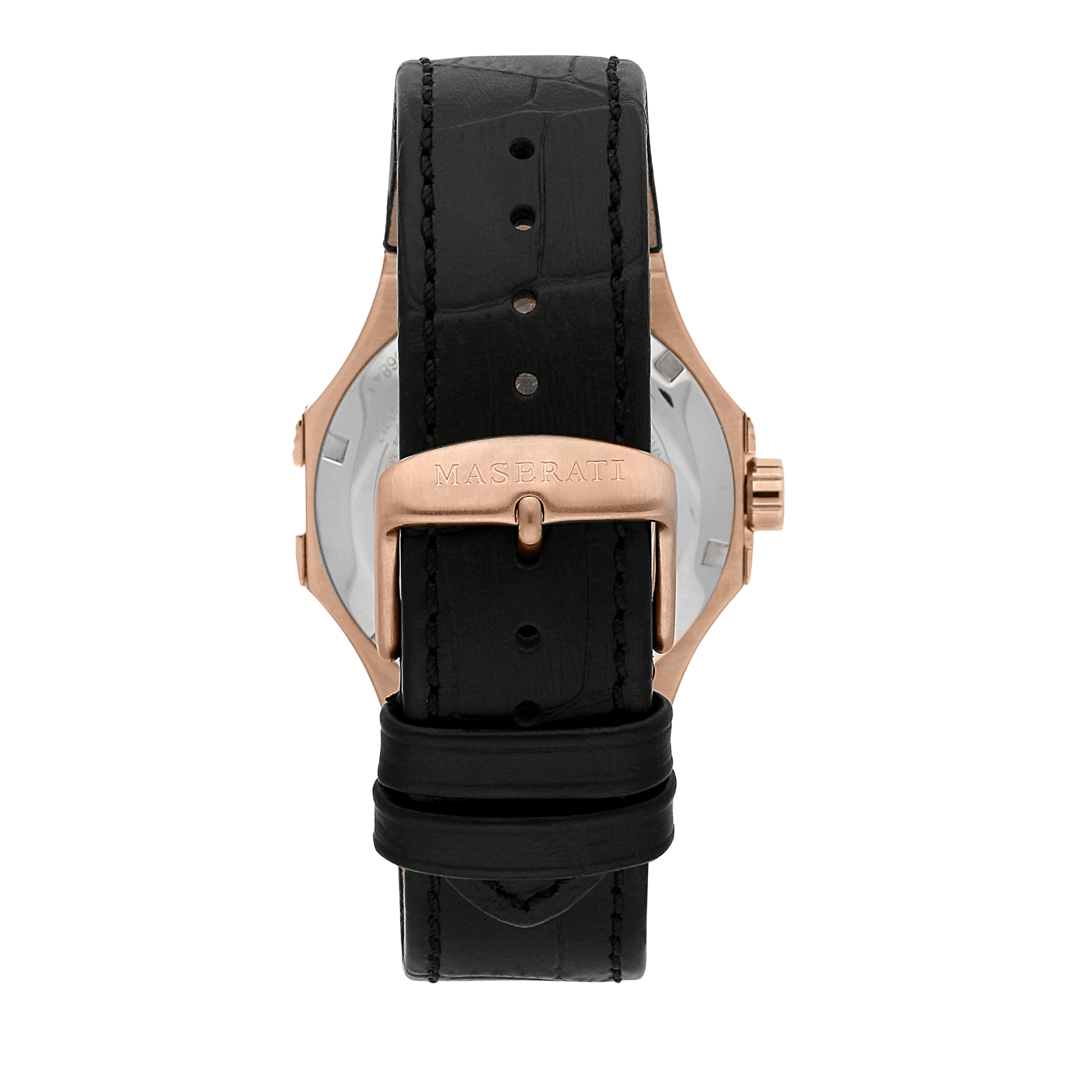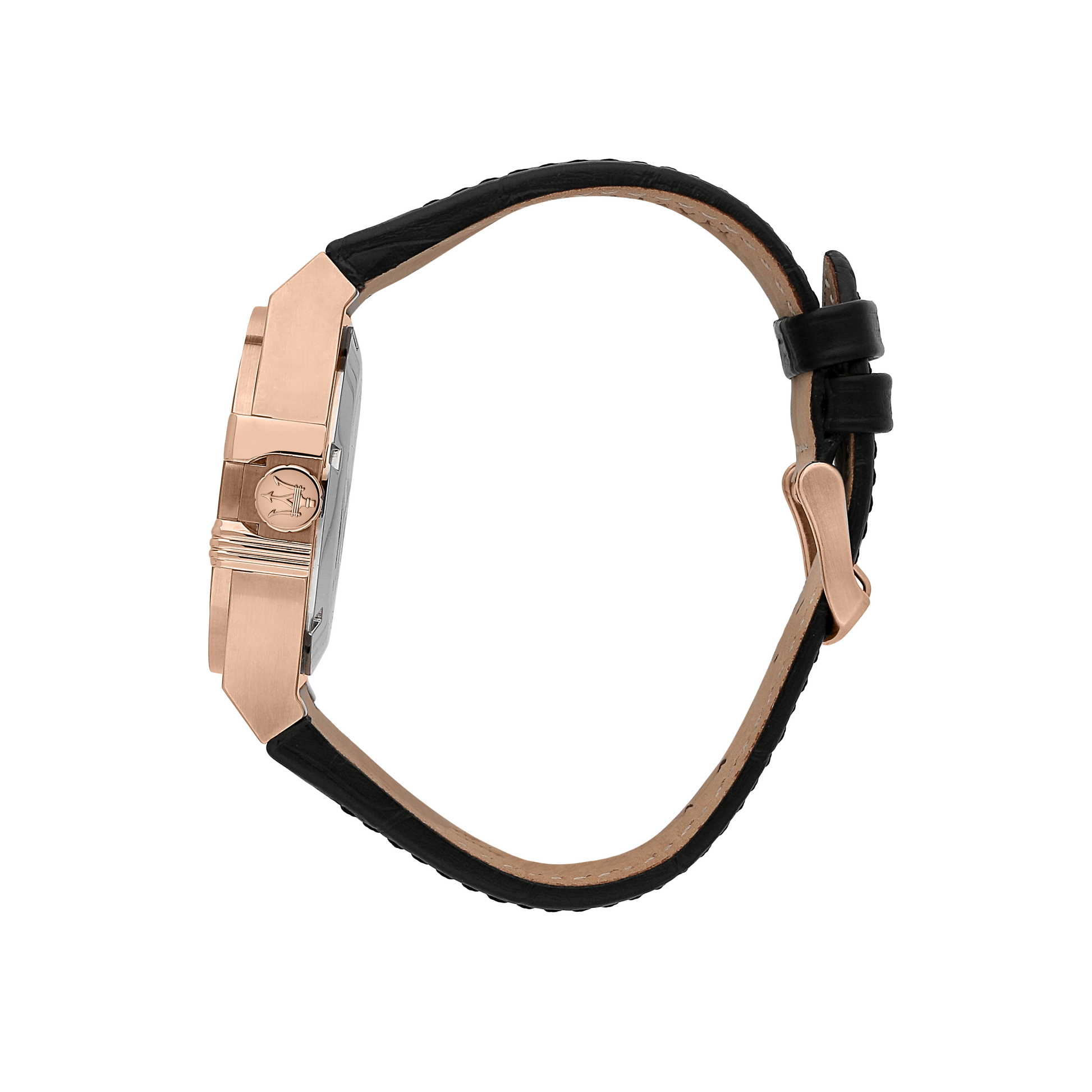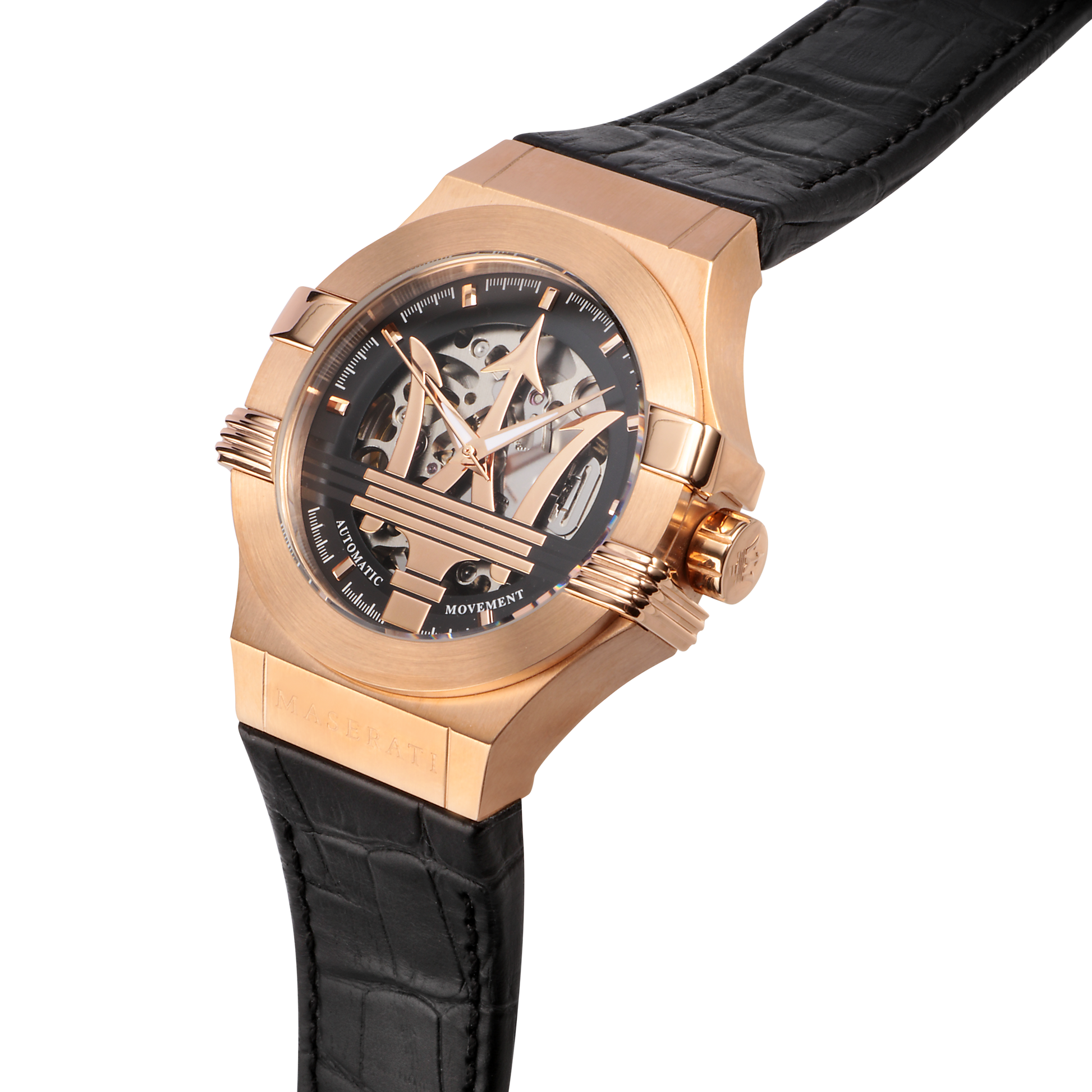 Maserati's best selling watch is this automatic Potenza timepiece which features a bold rose gold case, smooth black leather strap and skeleton dial which shows off the intricate detailing of the automatic movement with the iconic Maserati logo.The watches from the Potenza collection feature an innovative design, characterised by clean lines which interpret the stylistic features of the Maserati tradition in an extremely modern fashion. The large Trident logo at the centre of the dial combines with the shapes of the bezel, giving the case a dynamic look.