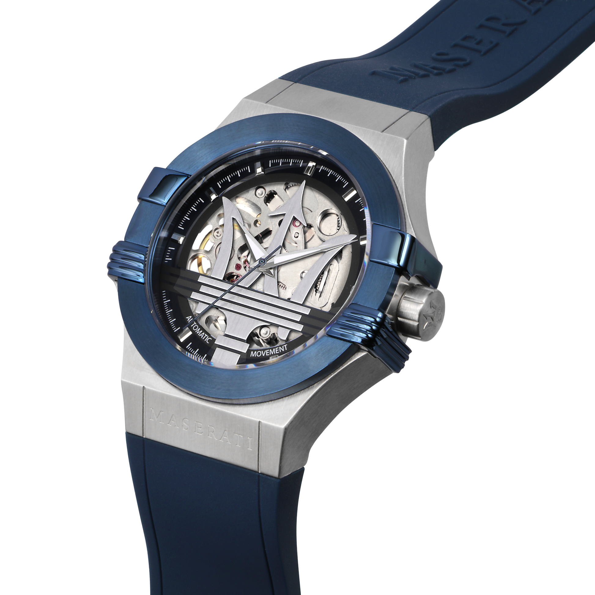 Maserati's best selling watch is this automatic Potenza timepiece which features a bold rose gold case, smooth black leather strap and skeleton dial which shows off the intricate detailing of the automatic movement with the iconic Maserati logo.The watches from the Potenza collection feature an innovative design, characterised by clean lines which interpret the stylistic features of the Maserati tradition in an extremely modern fashion. The large Trident logo at the centre of the dial combines with the shapes of the bezel, giving the case a dynamic look.