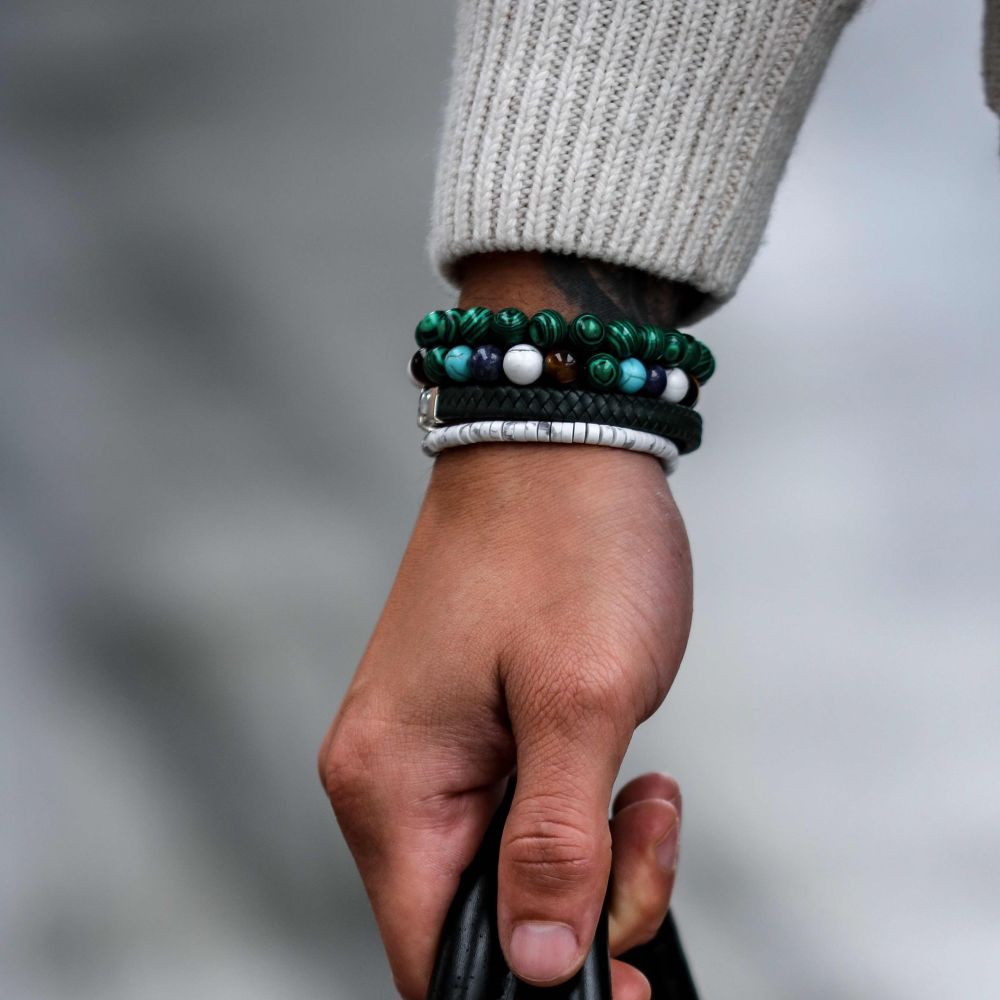Gemstone bead bracelet, handmade from 8mm Howlite White, Tiger Eye, Art.Malachite, Moss Agate and Brecc.Jasper natural stone beads with a stainless steel clasp. The Rebel & Rose jewelry is easy to combine with other silver, leather or bead bracelets.
