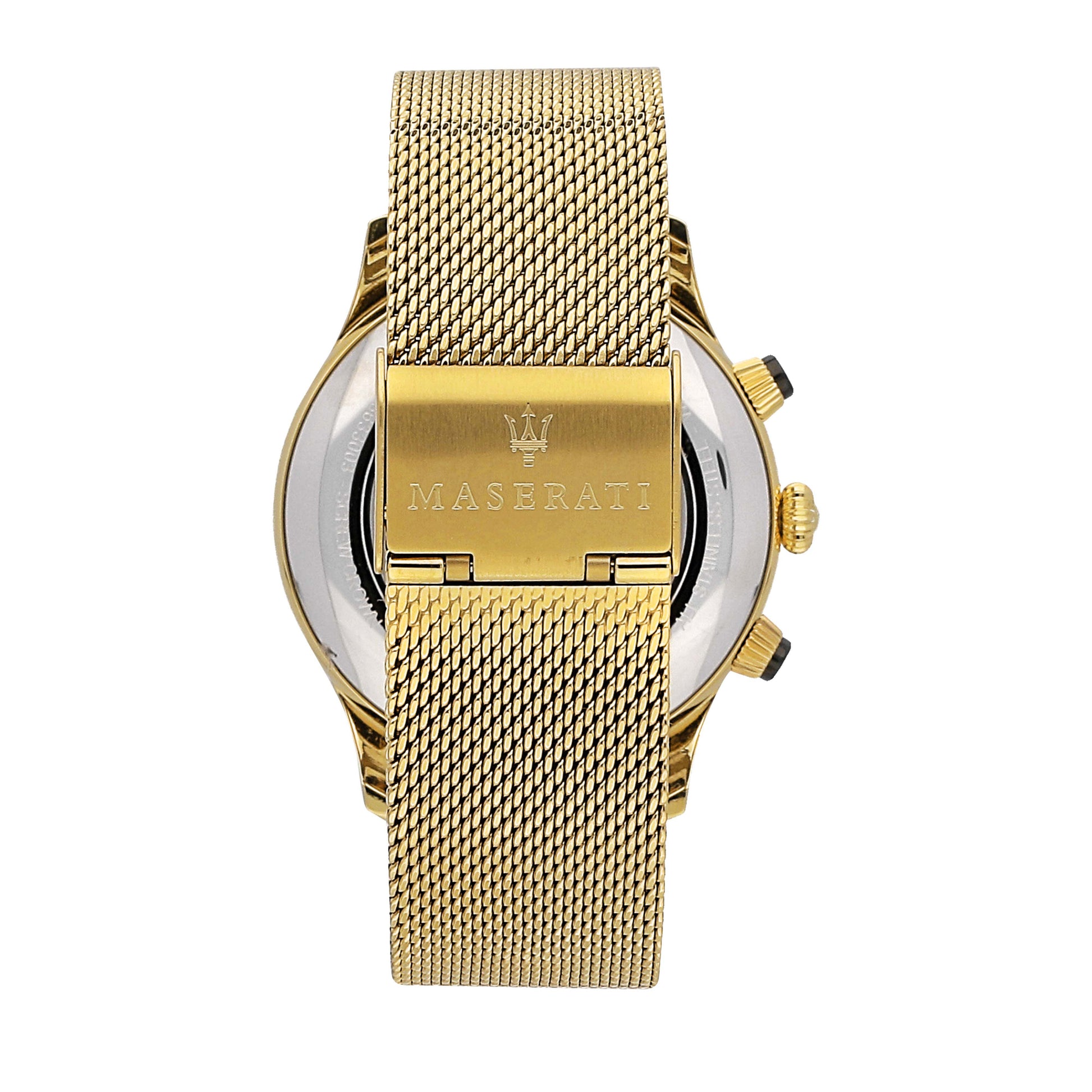 The Maserati Ricordo collection owes its name to the simple design which evokes a retro ambience. Encased in gold-toned stainless steel and featuring a multi-functional sleek black dial, this elegant timepiece is completed with a gold-steel steel mesh strap.