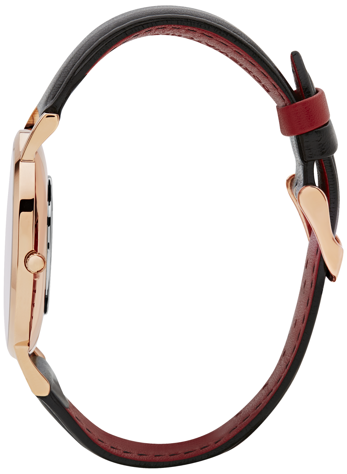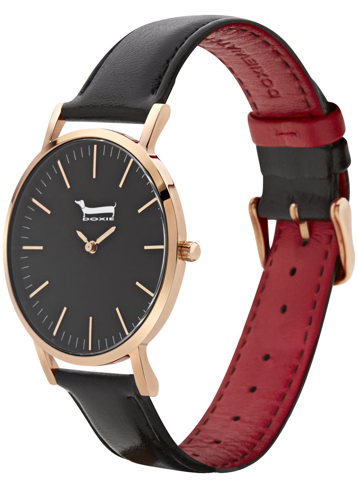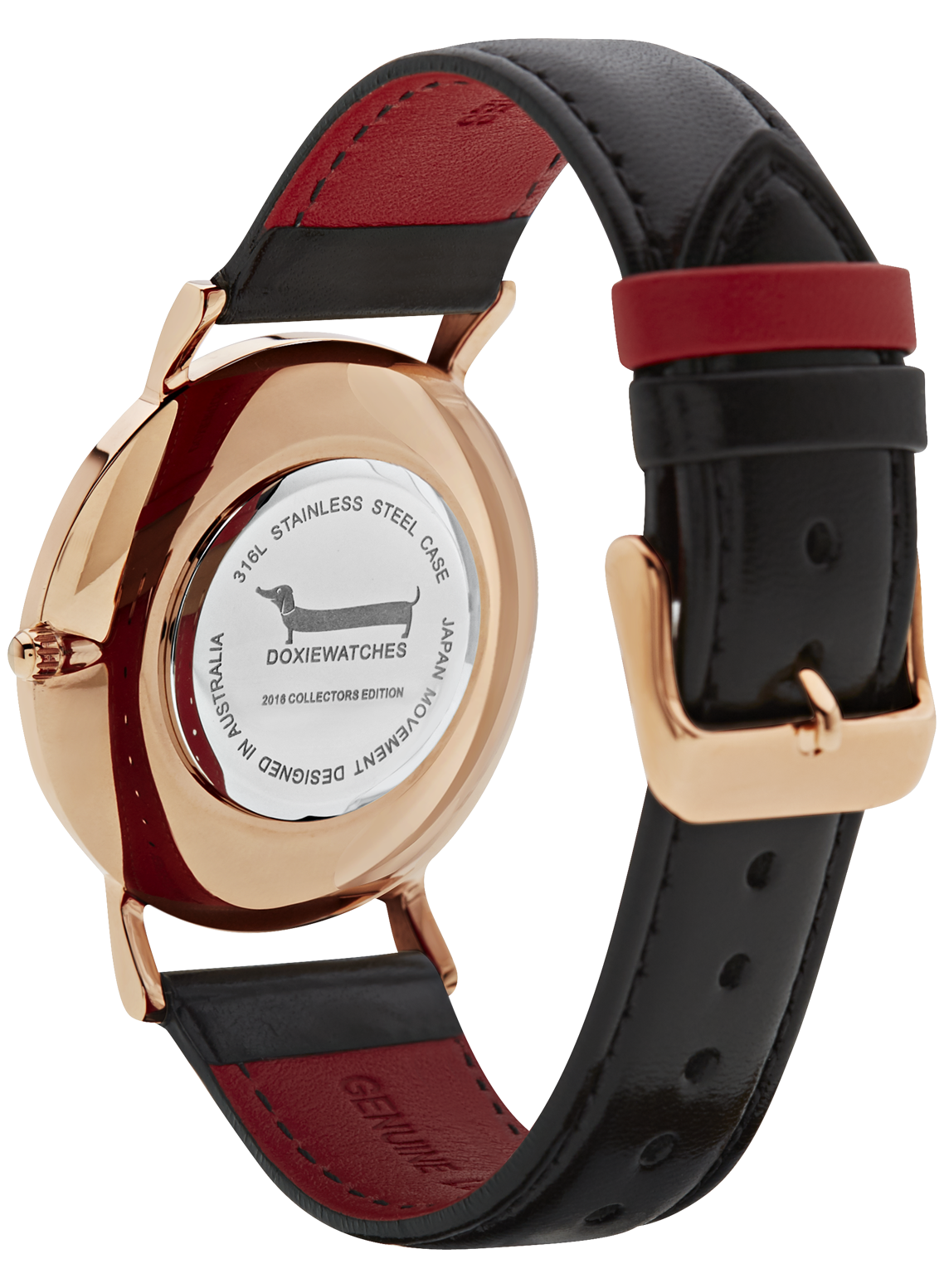 The Sophie watch is named after our gorgeous black and tan. The striking design of the watch features a quality black leather strap with the signature red leather inner and keeper on a rose gold case.