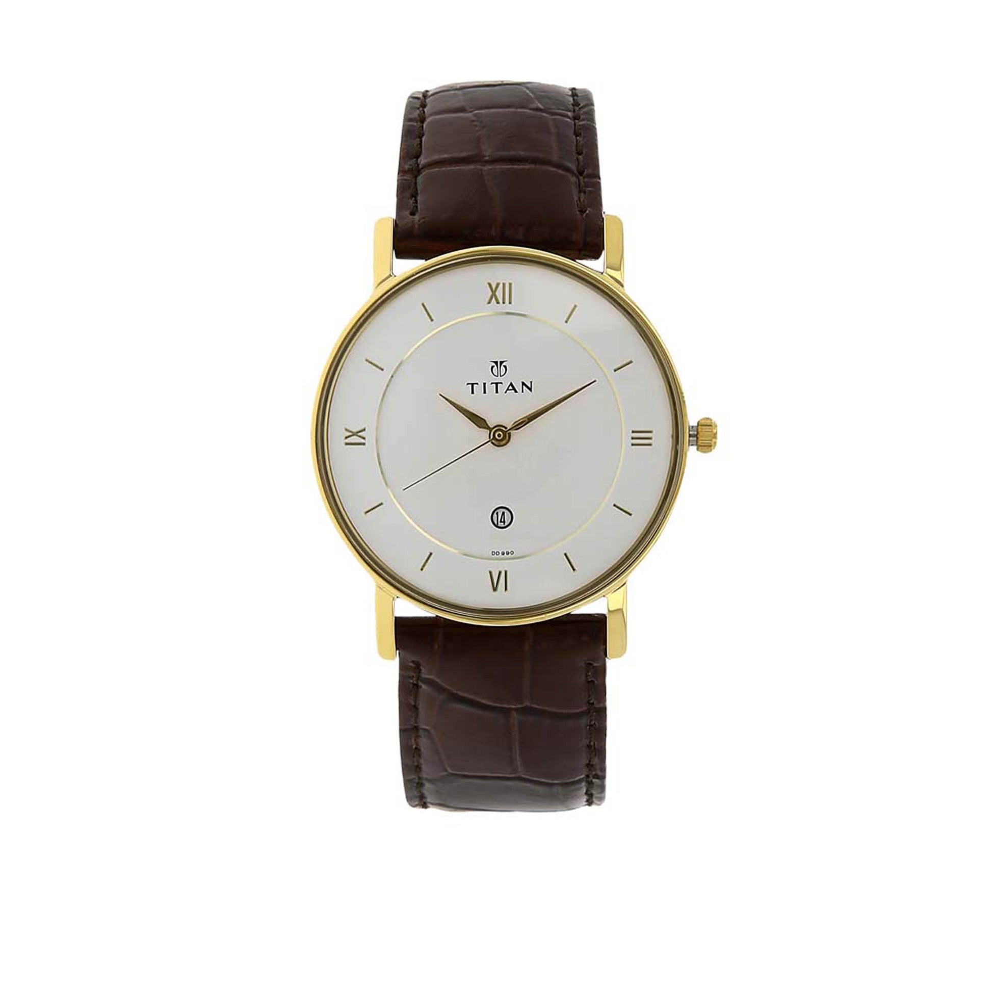 The Titan Quartz Analog Watch for Men features a crisp white dial with a practical date function, paired with a classic leather strap. Its clean, timeless design offers both elegance and functionality for any occasion.