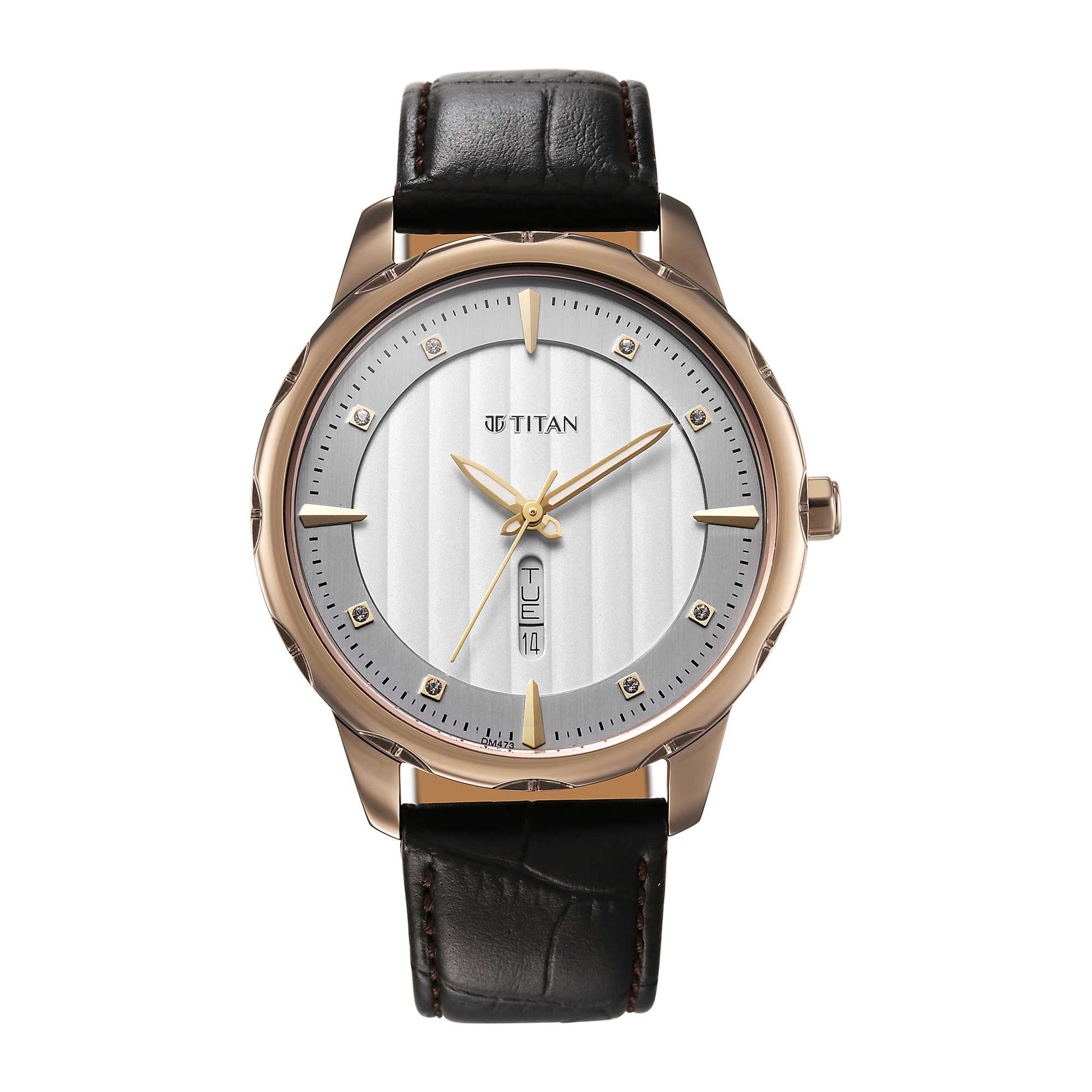 The Titan Regalia Opulent features a classic black dial with quartz precision, day & date functionality, and a rich brown leather strap. This watch blends sophisticated design with timeless elegance, making it a versatile choice for any occasion.