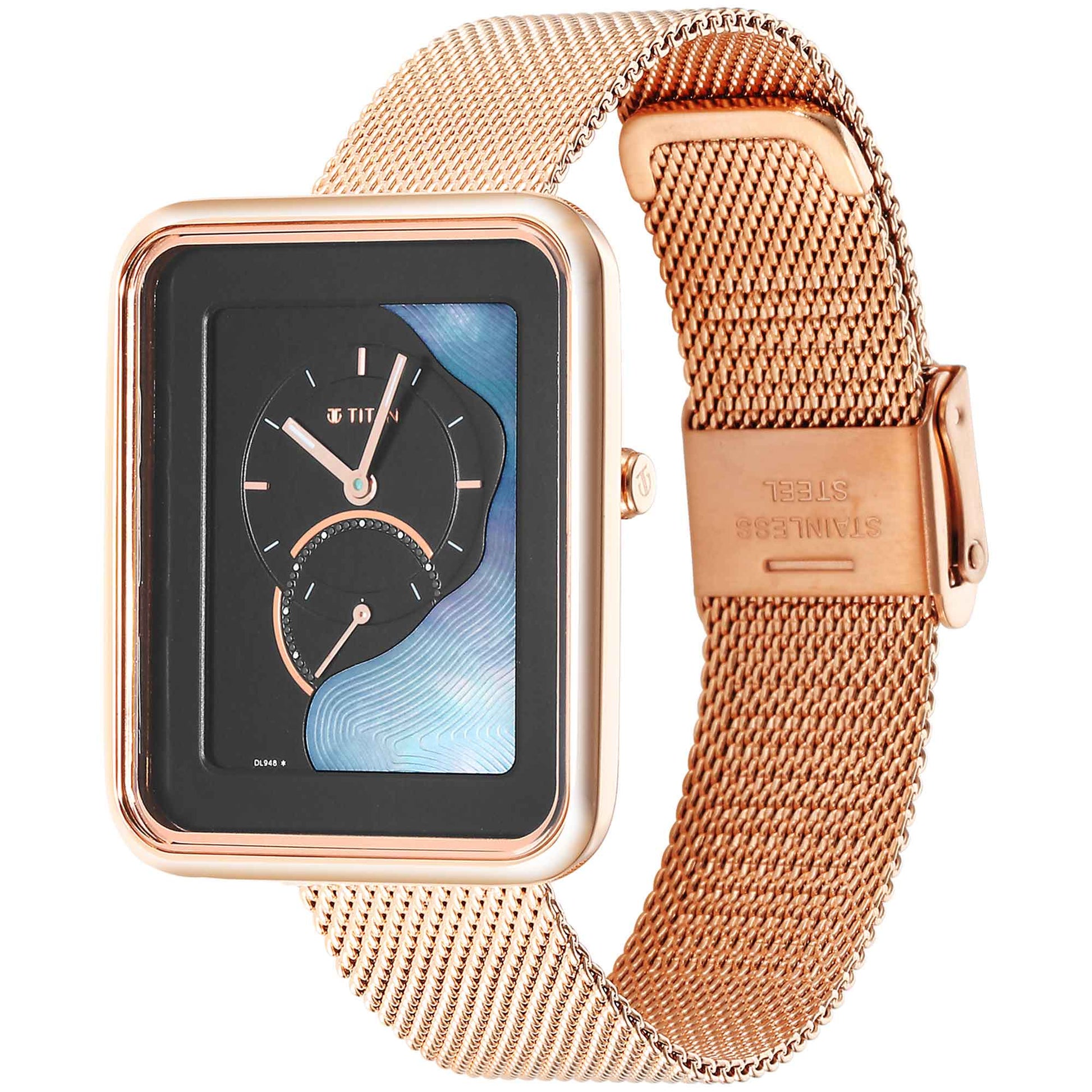 The Titan Wander showcases a sophisticated black mother-of-pearl dial and an elegant analog display. Its distinctive design and gleaming finish add a touch of refinement to your wrist. This timepiece is ideal for those who appreciate understated luxury.