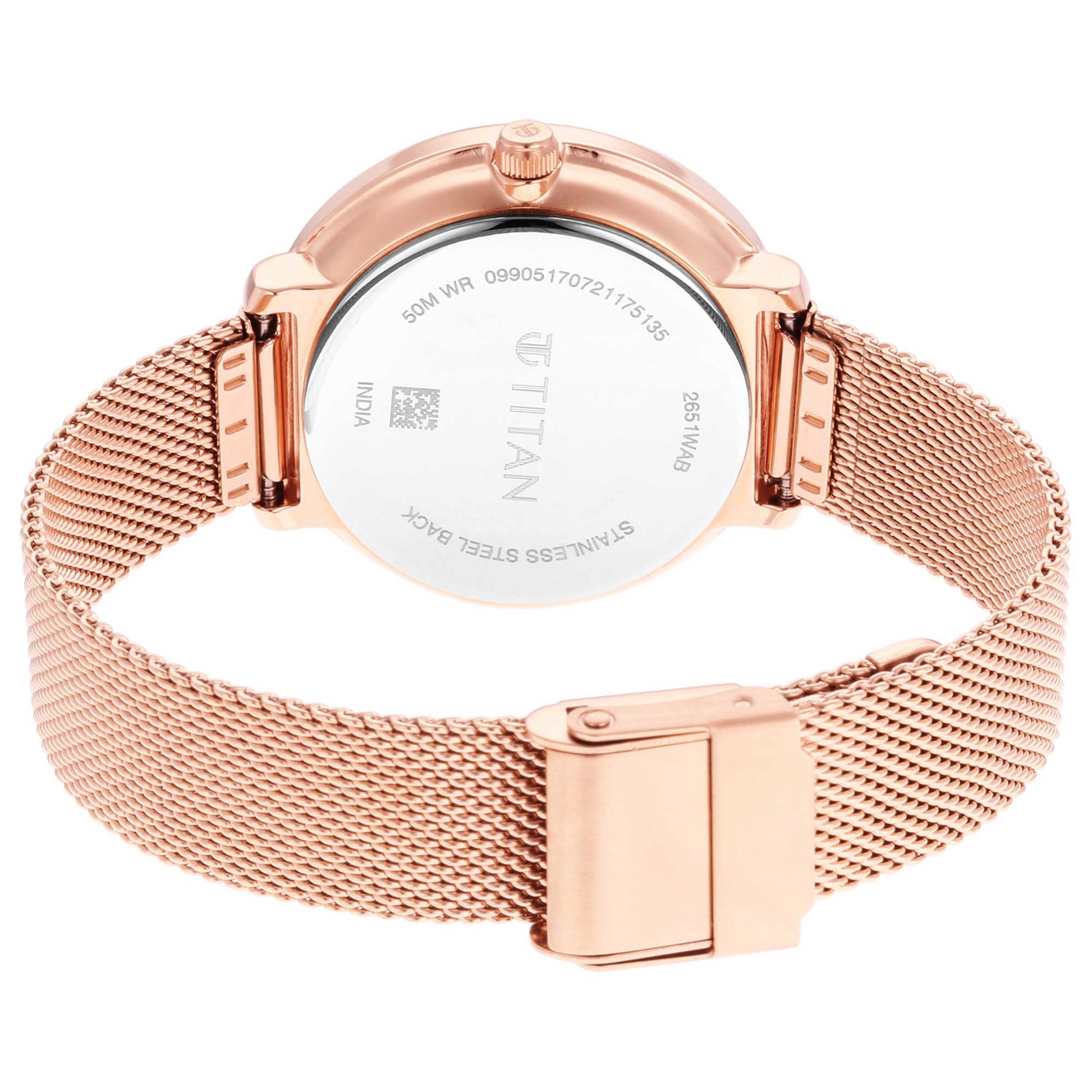 The Titan Workwear Quartz Analog Watch showcases a sleek silver dial paired with a luxurious rose gold stainless steel strap. Its refined design and elegant color contrast make it a stylish choice for everyday wear.